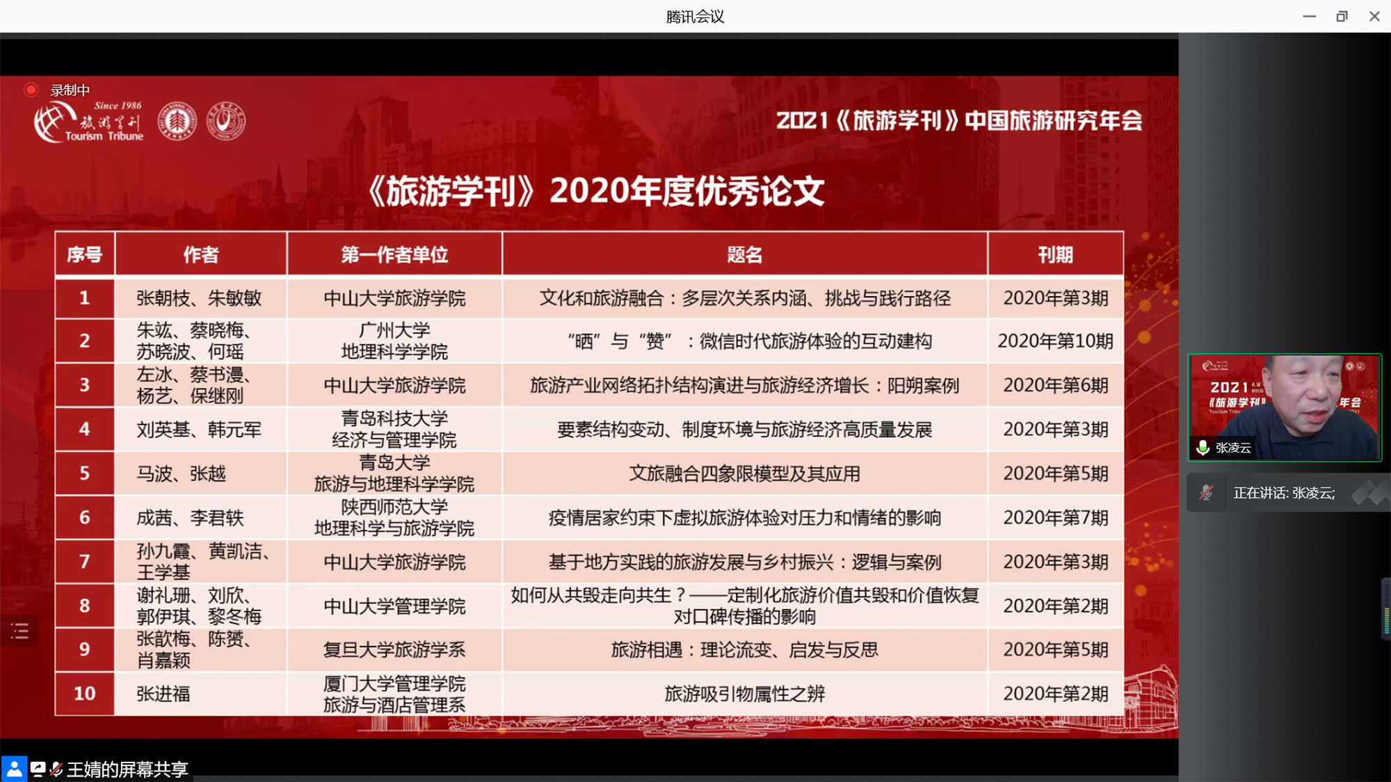 主题报告结束后,张凌云教授主持《旅游学刊》2020年度“中国旅游发展笔谈”火花奖和2020年优秀论文的表彰环节。《旅游学刊》笔谈火花奖从2015年开始设立,旨在鼓励和奖励学界、业界真正有思考、有启发的声音。受疫情影响,笔谈“火花奖”和2020年度论文的评选通过线下线上相结合的方式进行,由《旅游学刊》编委组成“《旅游学刊》年度论文评选委员会”进行集中闭门评选,共遴选出2篇2020年度优秀笔谈。同时,通过两轮投票和打分,经线上合议和确认性投票,共评选出10篇《旅游学刊》2020年年度优秀论文。年度优秀论文选题各异,均根植于丰富的中国旅游发展实践,兼具理论和实践价值、研究规范,反映了中国旅游发展和学术研究亟需解决的一些重要问题。