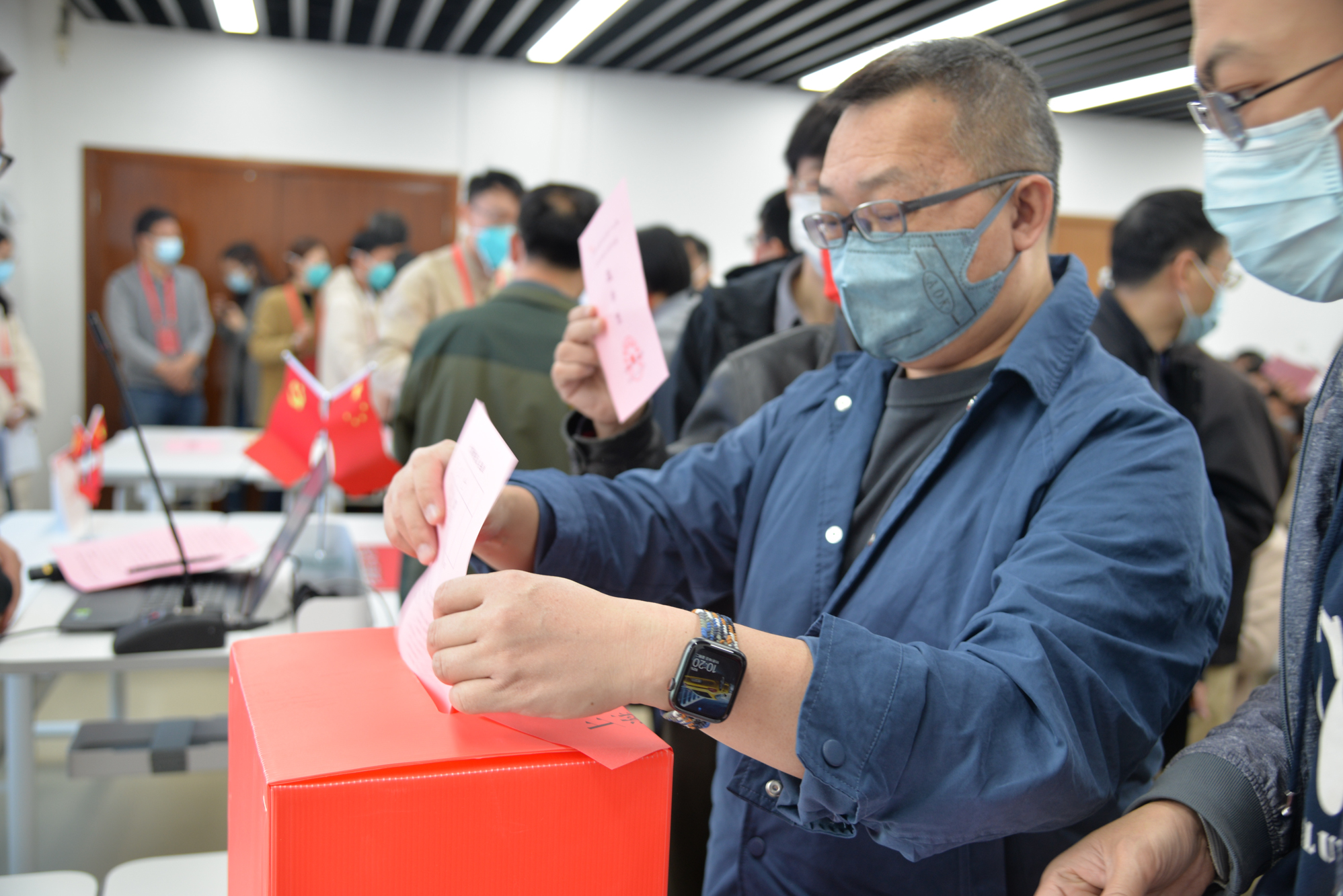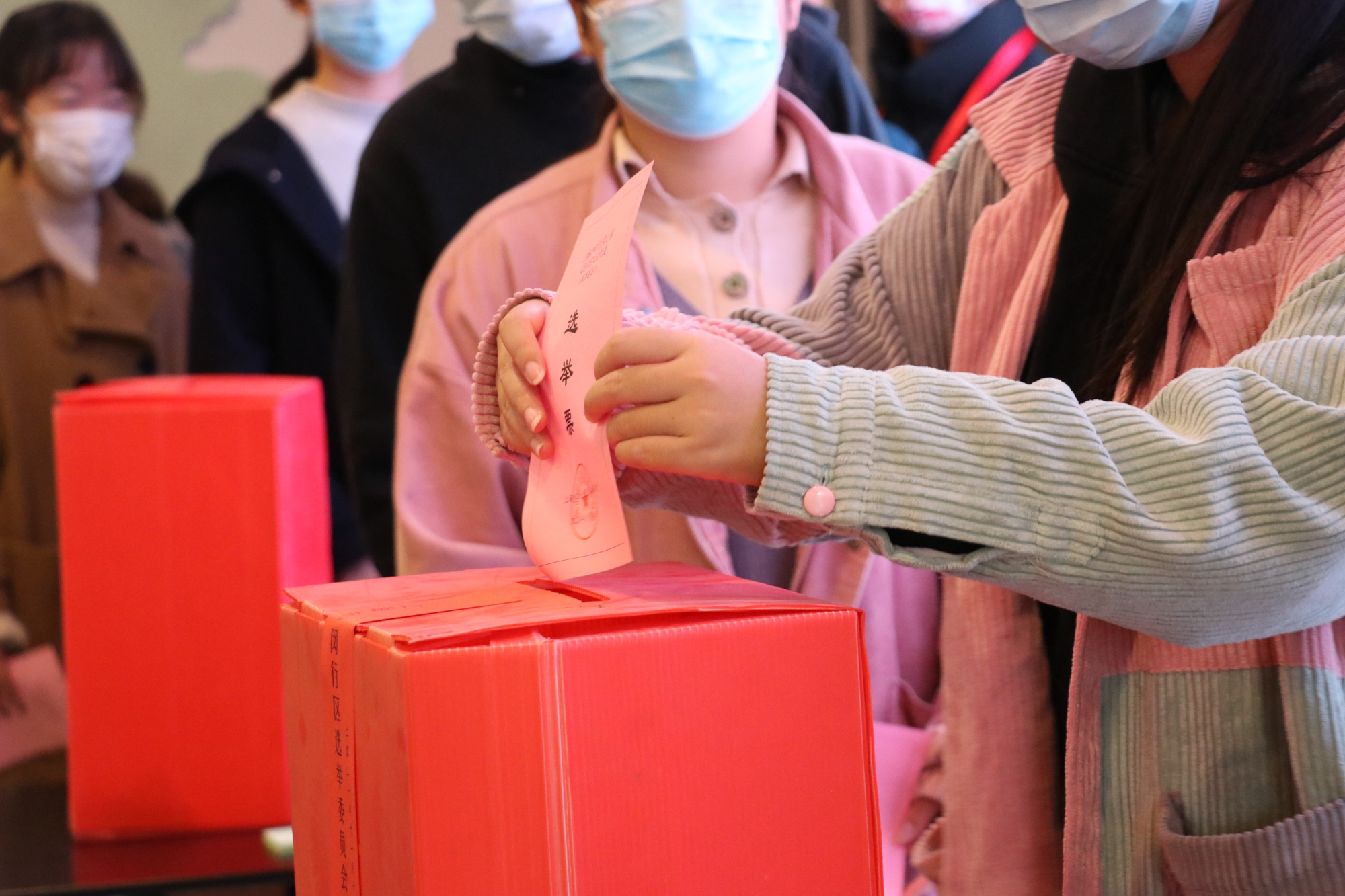 选举日当天,各个投票站按照校选举办公室的部署分场次集中有序地召开选举大会。选举投票现场氛围庄重热烈,红色票箱摆在醒目位置,投票站设置严格按照要求,悬挂国旗、会标,张贴书写投票选举的注意事项。在清点选民人数,通过监票人、计票人名单后,工作人员依次分发领票、选民按照注意事项要求写票,并按照规定的路线投票,秩序井然。