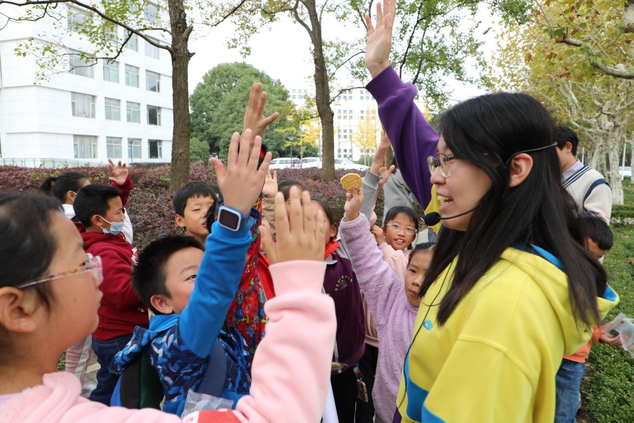 随后,“追光”大学生宣讲团、“追光”党员服务先锋队两支队伍在学校党建服务中心,指导孩子们动手开展了自制电风扇、彩虹试管、太阳能小车、小孔成像和三棱镜“画彩虹”等实验,使孩子们通过简单的小实验了解科学原理。在前往物理实验教学中心途中,小朋友们在志愿者的组织下唱儿歌、讲故事、猜谜语等,了解有关党、团的知识。在物理实验教学中心的科普基地,志愿者向小朋友们展示了静电球、能量穿梭机、角动量演示器、电流展示仪和动力发电装置等有趣的实验装置和仪器,解释了其中蕴含的物理知识和奥秘,孩子们在看展示、听讲解和动手操作中更加地贴近物理、了解科学。