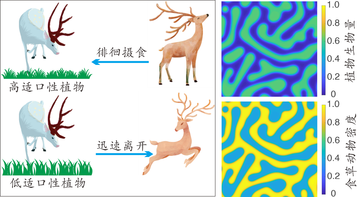 通过对模型进行理论分析发现,放牧生态系统的时空格局可由食草动物的选择摄食行为和植物适口度之间的正反馈激发,食草动物可下行控制植被的时空格局,这印证了先前有关食草动物摄食和植被时空格局的实验观测。当食草动物遇到低适口性但高生物量的植物时,他们会加快移动速率去寻找高适口性但低生物量的植物,而当食草动物遇到低生物量的植物时,他们会放慢移动速率去摄食这些植物(图3)。