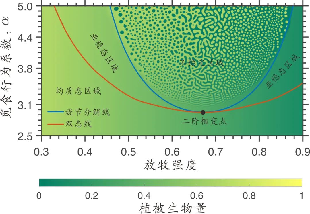图4 食草动物-植被模型的理论相图与数值模拟相图。“不稳定区域”指无穷小的扰动可导致放牧生态系统非均质空间格局形成的区域;“亚稳态区域”指强度和尺度足够大的扰动才可以导致放牧生态系统非均质空间格局形成的区域;“均质态区域”指放牧生态系统只会保持全局均质空间格局的区域;“二阶相变点”指系统状态关于参数的一阶导数连续且二阶导数不连续的相变点。
