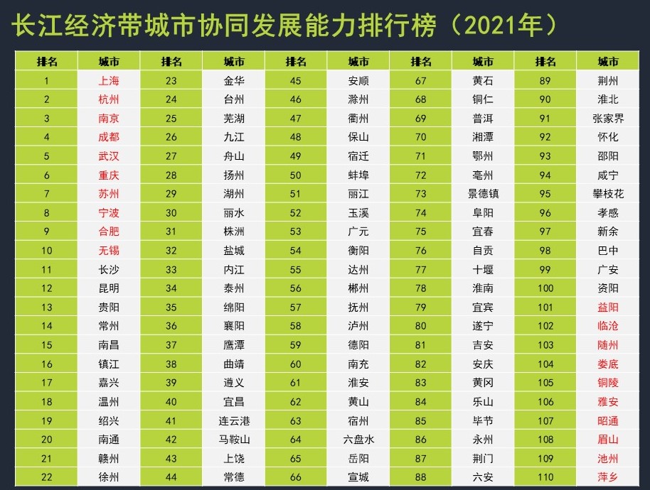 长江经济带城市协同发展能力指数(2021)表明,协同发展能力前十强城市依次为:上海、杭州、南京、成都、武汉、重庆、苏州、宁波、合肥、无锡。无锡因生态支撑能力提升重回TOP10;武汉受新冠疫情影响在交流服务方面受挫跌出前三甲。益阳、临沧、随州、娄底、铜陵、雅安、昭通、眉山、池州、萍乡则位列排行榜的后十名。宜宾成为最大黑马,从2020年的104名跃居2021年的第79名。