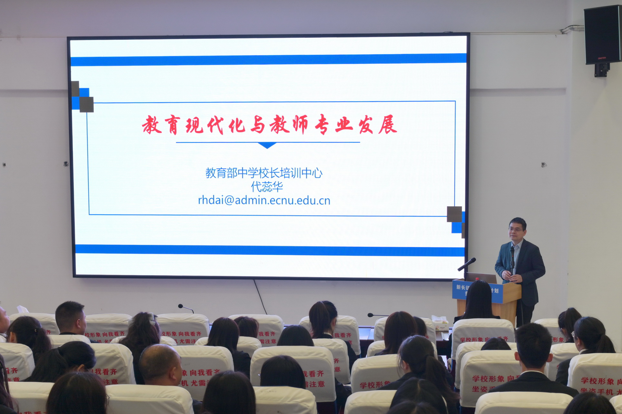 教育部中学校长培训中心主任代蕊华教授为项目学校教师及部分兄弟学校教师代表作了题为《教育现代化与教师专业发展》的专题报告,从教育现代化的背景出发,阐述了教育现代化的划时代意义,强调教育现代化需要把教师队伍建设作为基础工作,明确了教师专业发展的新要求,鼓励教师们争做新时代高素质、专业化、创新型的好老师。