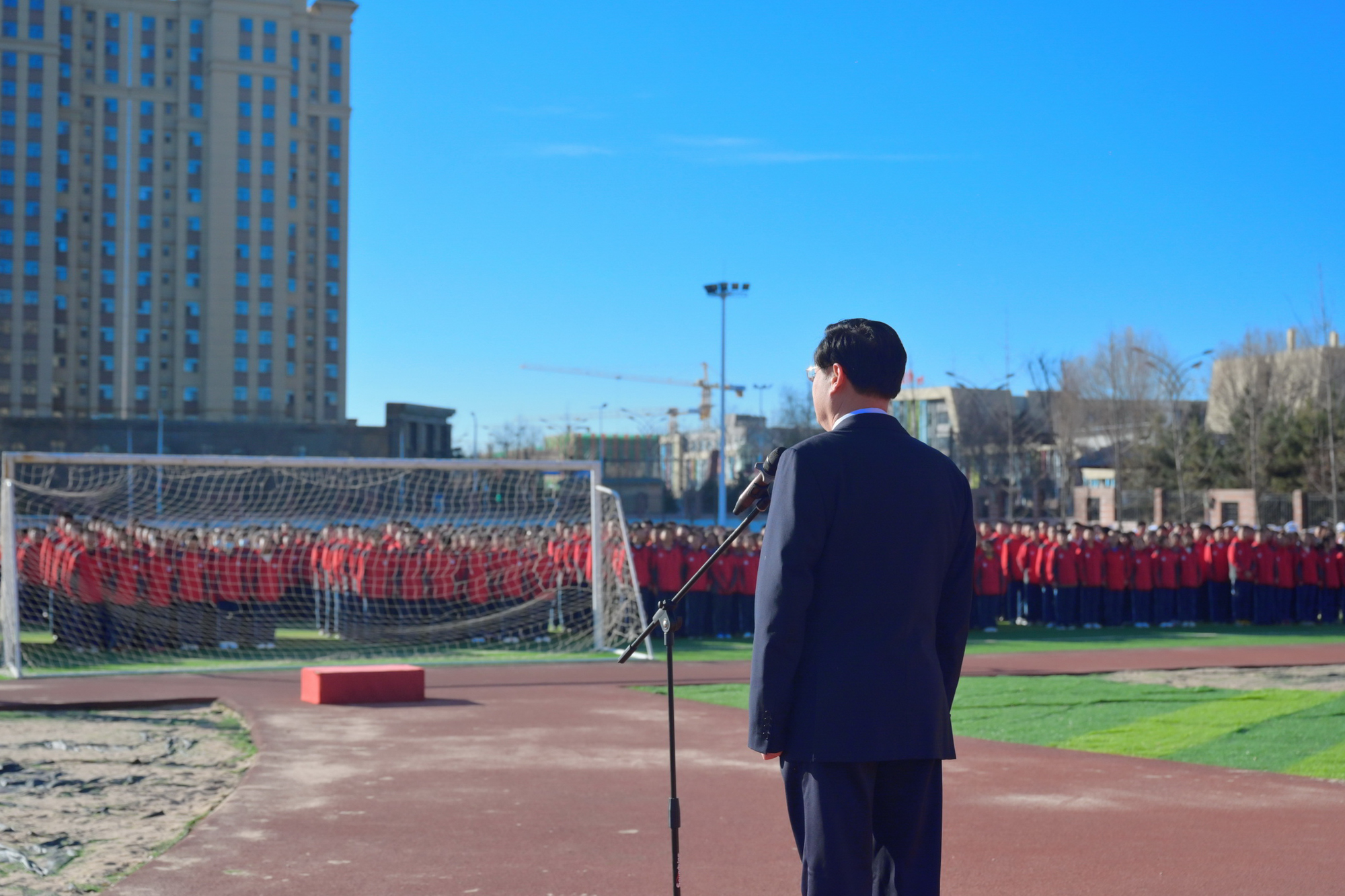 专家组一行还观摩了延安市新区第一中学升旗仪式,张长东代表专家组讲话,勉励同学们要坚定革命理想,为祖国发奋学习;坚决爱党爱国,努力将自己锻造为社会主义合格的建设者和接班人。在新时代赓续红色血脉,传承红色精神,实现自己在国旗下的誓言。