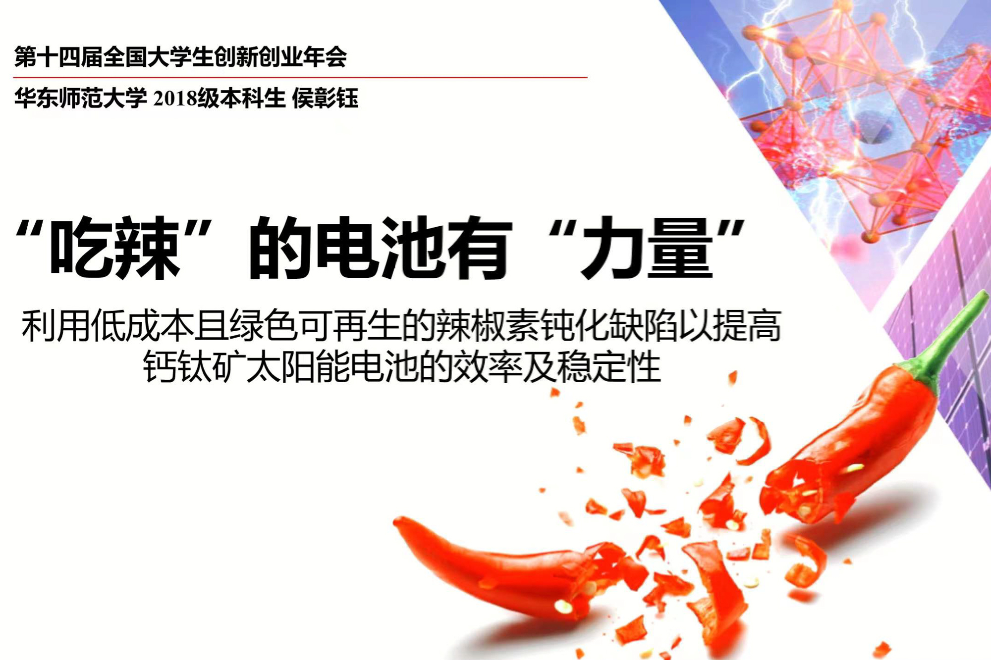侯彰钰同学的获奖论文将天然物质辣椒素添加在钙钛矿前驱体溶液中用于制备钙钛矿太阳能电池,通过光电子能谱原位表征技术,直接观察到添加辣椒素的钙钛矿MAPbI3表面能级从p到n型完全转变的新现象。该论文发表在能源领域顶级期刊Joule(工程技术Top1区,影响因子41)上,侯彰钰同学为共同第一作者。