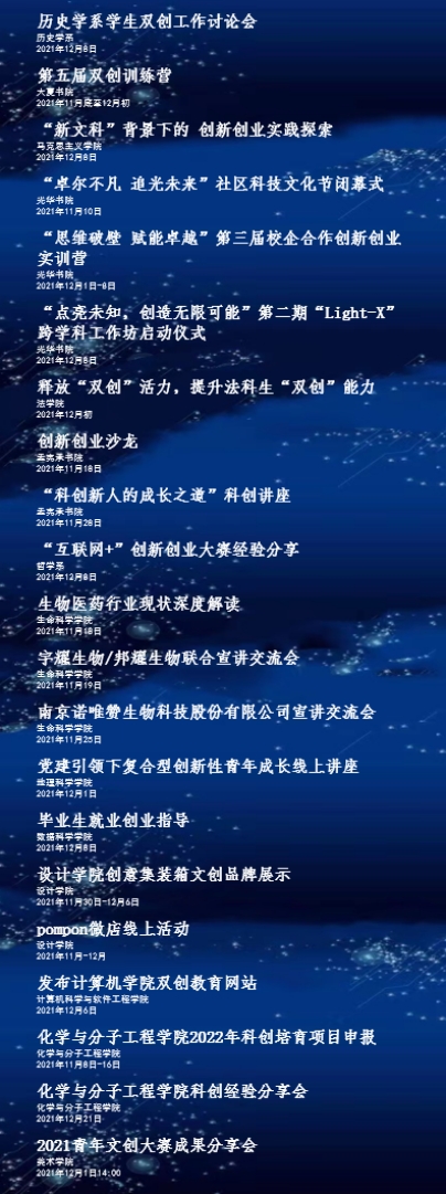 本届创新创业教育周活动清单于开幕式上发布。2021年度创新创业教育周由完美(中国)官方创新创业学院、教务处、研究生院、团委共同举办,于12月10日至17日举行。活动期间,开幕式暨创新创业教育论坛、2021年度完美网页版创新创业成果展、第七届本科生创新创业学术论坛、研究生创新实践系列大赛高端论坛、“科创先行 强国有我”大学生科创竞赛交流分享会、中国国际“互联网+”大学生创新创业大赛交流会、闭幕式等7项校级活动,马克思主义学院“新文科”背景下的创新创业实践探索、光华书院“Light-X”跨学科工作坊等学部、书院、院、系30余项活动举行,展现新一代师大人朝气蓬勃的生命力和不断迸发的创新力,孕育学校学生创新精神和创业梦想。