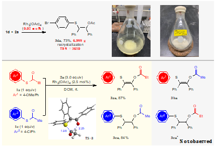 刘路教授团队长期致力于高选择性的卡宾转移反应研究(Chem. Soc. Rev. 2016, 45, 506; J. Am. Chem. Soc. 2014, 136, 6904; Angew. Chem. Int. Ed. 2016, 55, 14807; Angew. Chem. Int. Ed. 2017, 56, 2749; Chem. Sci. 2016, 7, 1988; Chem. Sci., 2019, 10, 6553; Chem. Commun., 2020, 56, 8202)。针对含硫多取代烯烃立体选择性问题,课题组利用重氮化合物和酰基硫酯设计了一种模块化快速构建含硫四取代烯烃的方法,有效解决了顺/反异构体的问题。通过交叉实验和DFT计算,课题组对反应机理进行了深入阐释,证明五元环过渡态是实现立体选择性控制的原因。该方法可以通过“拼积木”的方式将含硫四取代烯烃的四个部分进行多样性组合,成为合成此类分子的高效工具。通过该策略,课题组快速构建了超过60个TVS分子,测试表征发现含不同取代基的TVS具有不同的光物理性质。