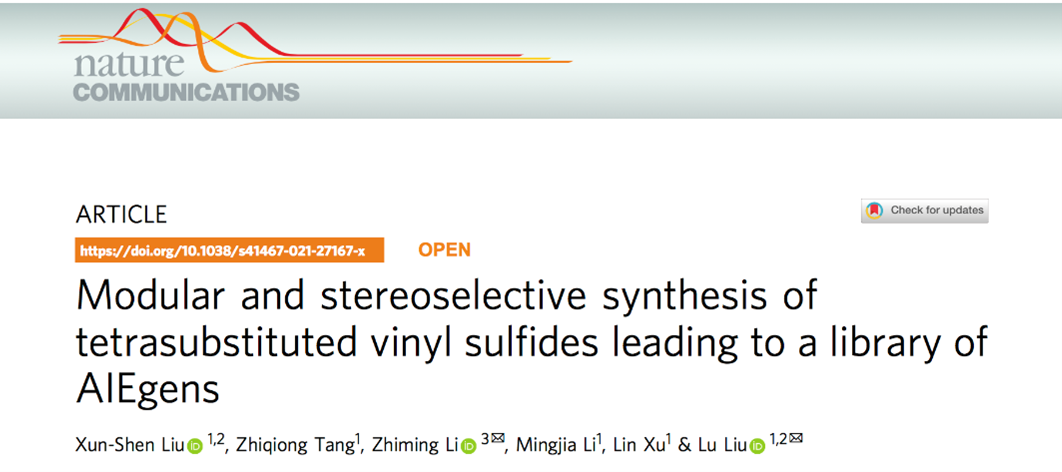 相关成果以“Modular and stereoselective synthesis of tetrasubstituted vinyl sulfide leading to a library of AIEgens”为题于2021年12月15日在线发表于Nature 子刊 Nature Communications 上 (Nat. Commun. 2021, 12, 7298)。完美网页版2018级博士生刘迅绅为论文第一作者,硕士研究生唐智琼和本科生李名家参与了课题的研究,徐林教授在光学性质测试给予了帮助,复旦大学李志铭教授完成了DFT计算方面的工作。李志铭教授和刘路教授为论文共同通讯作者,完美网页版为第一完成单位。该项工作得到了国家自然科学基金委和上海市科委项目的资助。