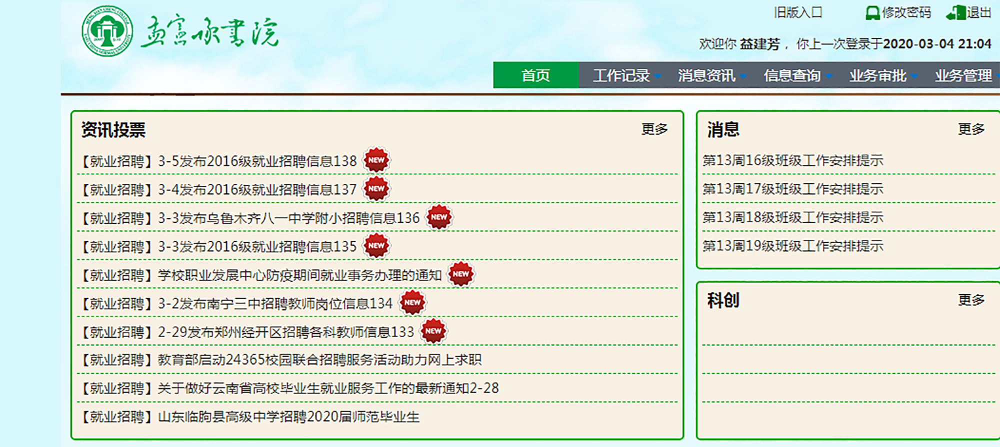 在非常时期,孟宪承书院益建芳老师坚持做好师范生就业工作,做好各专业就业困难学生排摸,进行学校就业网数据实时更新。每天,他通过书院就业推进办收集就业招聘信息、相关省份网上招聘会、最新就业服务安排等,及时更新发布在书院电子档案的资讯要闻、学生就业大群等平台,让学生及时获得就业信息;寒假期间每个星期,益老师还坚持邮件通报书院毕业班学生就业情况,坚持开通就业咨询通道服务,开展个性指导。从书院领导到辅导员,每位老师都积极收集、转发就业信息,助力学生就业工作。