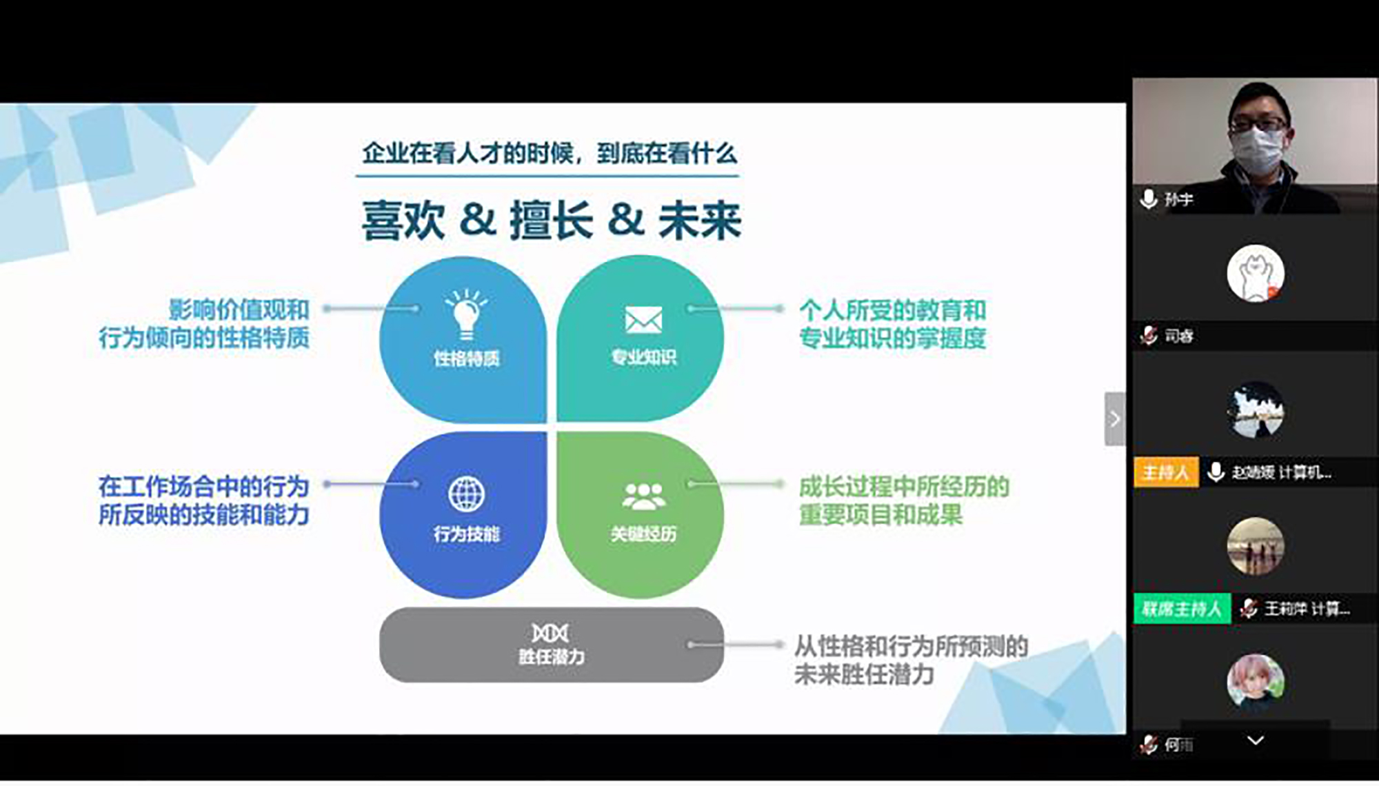 在疫情特殊时期,计算机科学与技术学院毕业班辅导员赵婧媛、杨文彧逐一排查全体毕业生的就业状况,及时关注就业困难学生,疏导学生心理压力,全方位提供就业指导。2月中旬起,辅导员就通过问卷、微信、电话等多渠道对就业去向未明确的学生进行及时跟进,并主动联系用人单位,挖掘新一轮招聘需求,为学生提供更多就业机会。3月初,学院开通“空中就业‘云’服务”,对就业困难同学提供简历诊断、面试指导、定向推荐等一对一精准服务。辅导员赵婧媛召开本科毕业班就业云分享视频会,在特殊时期为100多位毕业班学生提供线上就业服务。学院邀请多位优秀校友分享考研复试成功经验;知名企业资深人才发展负责人进行就业准备“云”培训,校学生职业发展中心主任刘继亮老师参与活动并鼓励同学们,在疫情下主动出击,乐观面对,青春不负,勇敢追梦。