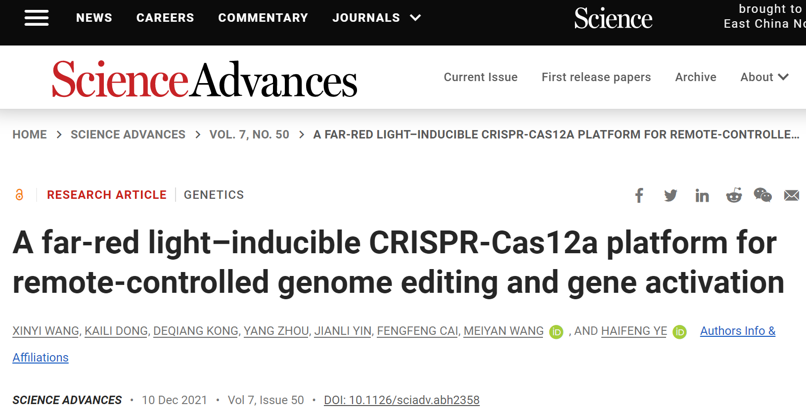2021年12月10日,完美网页版生命科学学院、上海市调控生物学重点实验室、完美网页版医学合成生物学研究中心叶海峰课题组在国际著名学术期刊《科学—进展》(Science Advances)在线发表了题为 A far-red light–inducible CRISPR-Cas12a platformfor remote-controlled genome editingand gene activation 的研究论文,报道了一种远红光调控的基因编辑和表观遗传重塑的控制系统,为精准可控的基因编辑技术再添一员大将。这是继2020年7月开发的光控基因编辑工具FAST系统之后(Yuetal, Science Advances, 2020),开发的另一种全新版本。