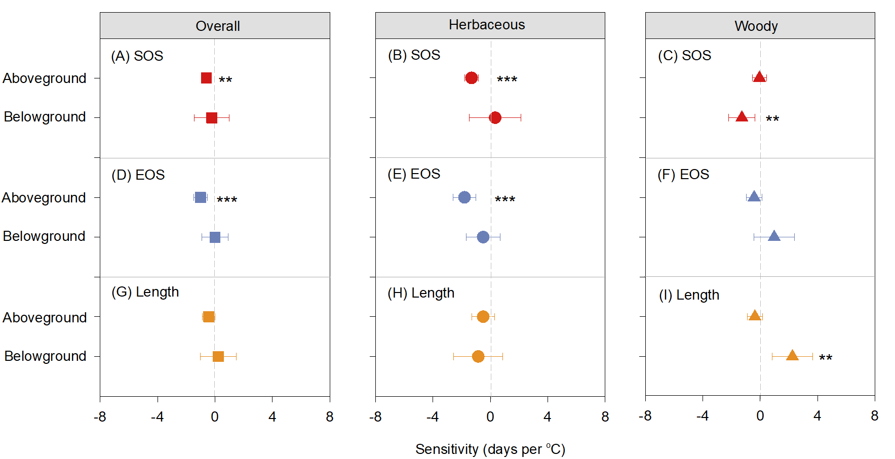 研究结果显示,植物地上与地下物候对气候变暖的响应并不同步,且在不同功能型之间存在显著差异。对于草本植物,气候变暖显著提前了地上部分生长季的开始和结束时间,但对地下部分的物候期无显著影响。对于木本植物,气候变暖没有改变地上物候期,但延长了地下部分生长季的时长。这些发现表明,当前陆地生物圈模型仅仅关注于植物地上部分对全球气候变化的响应是不足的,未来应该进一步加强对植物地下物候动态的研究。