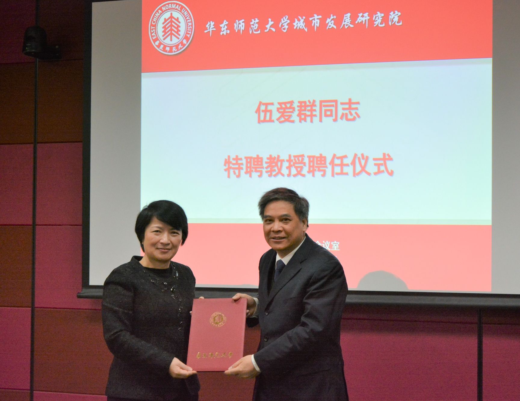 校党委书记梅兵为伍爱群(右)颁发特聘教授聘书