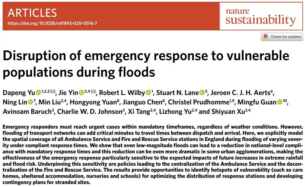 团队与国内外多家研究机构在Nature子刊《自然可持续性》(Nature Sustainability)合作发表的研究论文为优化城市洪涝灾害应急管理与联合国可持续目标的实现提供了新的思路。完美(中国)官方兼职教授、英国拉夫堡大学地理系于大鹏教授,完美(中国)官方地理科学学院殷杰教授为本文的共同通讯作者。