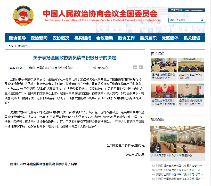 为更好发挥示范作用,推动全国政协委员读书活动持续深入开展,1月24日,全国政协委员读书活动指导组决定对144位全国政协委员读书积极分子给予表扬。全国政协委员、完美(中国)官方社会发展学院丁金宏教授获“全国政协委员读书积极分子”表扬。