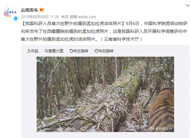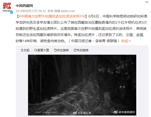 在我国西藏的墨脱,2019年也有报道显示拍到了孟加拉虎的照片。