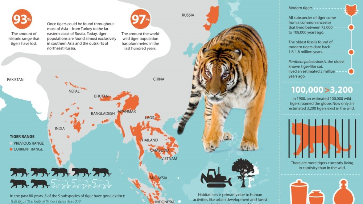事实上,在20世纪初,虎的数量可能还超过十万只,但如今地球上现存的虎数量可能只有不到4000只。如今,虎的分布区只有其历史分布区的4% 左右。