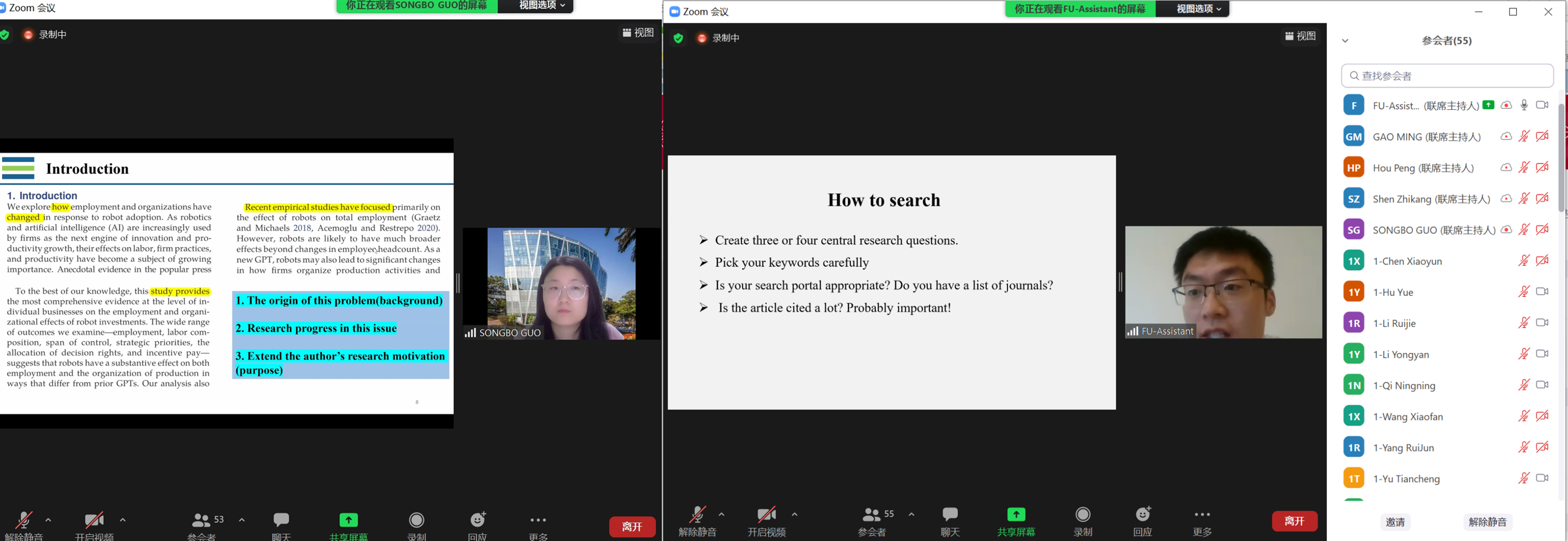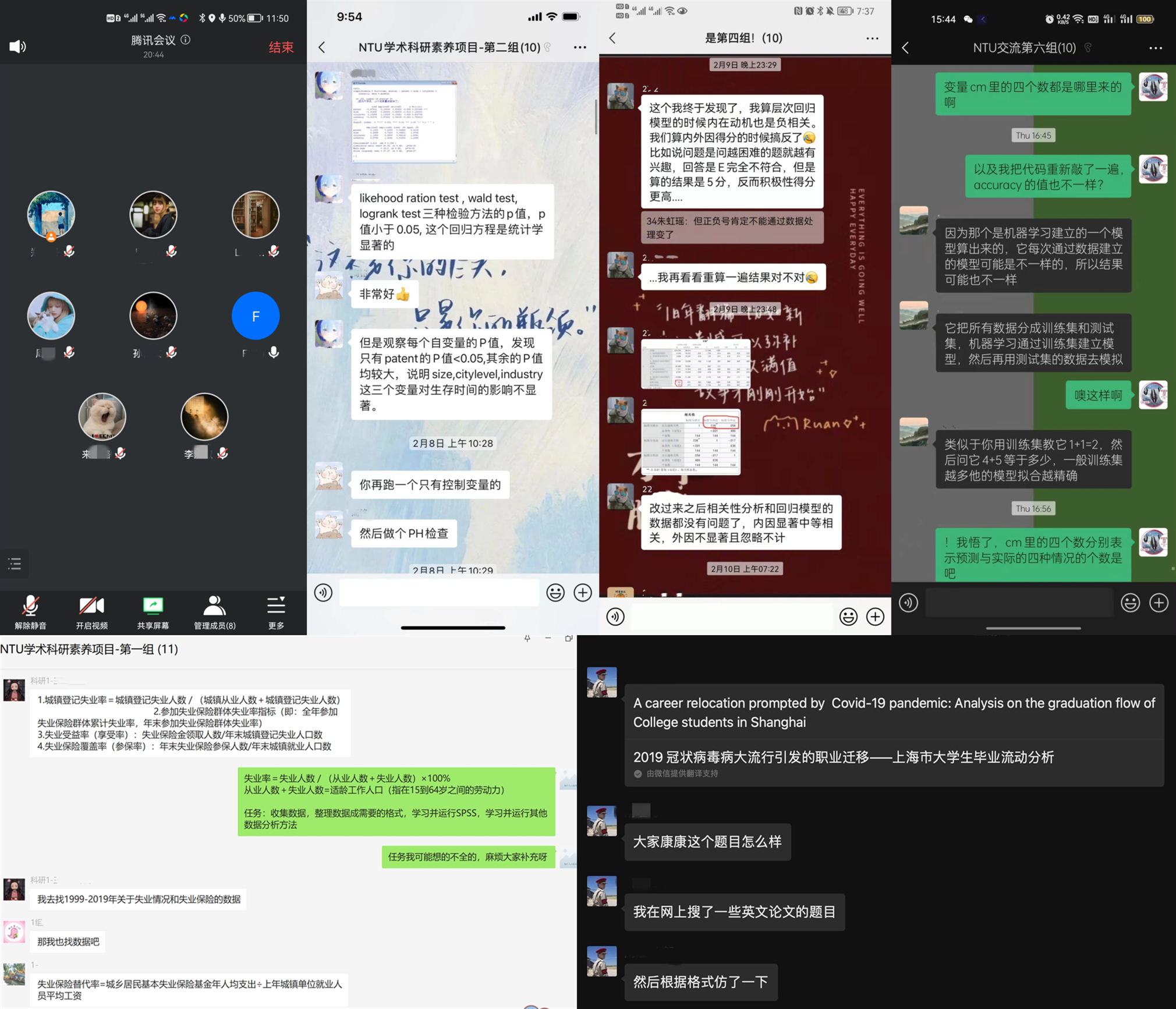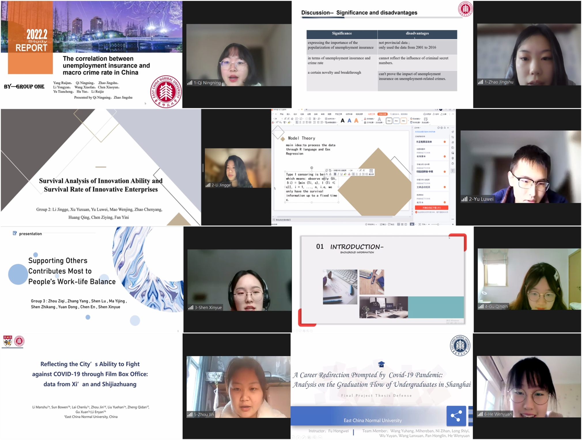 2月16日,各组进行自选题的结业汇报展示。每组通过数周的交流、磨合、合作,顺利完成课题。汇报的内容既有贴近校园生活的主题,如学习动机、职业生涯,也有社会问题相关,如创新型企业生存、失业保险等,呈现出多样性和创新性的特点。从展示的效果来看,每组合作顺利,展现了较强的沟通合作能力及良好的小组学习与研究氛围。课题展示获得了新方教授们的好评。