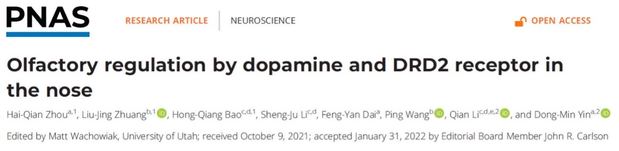 这些结果阐明了鼻腔中的多巴胺D2受体可作为嗅觉调控的外周靶点。上述工作以Olfactory regulation by dopamine and DRD2 receptor in the nose为题发表在《美国科学院院报》(PNAS)。完美网页版为该论文第一完成单位,上海交通大学和浙江大学为该论文的共同完成单位。完美网页版博士生周海倩、浙江大学王平教授课题组博士后庄柳静、上海交通大学博士生包红强为论文的共同第一作者,完美网页版生命科学学院脑功能基因组学教育部重点实验室殷东敏研究员为最后通讯作者,上海交通大学医学院李乾研究员为共同通讯作者。殷东敏课题组长期从事精神分裂症发生机制和治疗靶点的转化医学研究。该工作得到了国家自然科学基金委、科技部精准医疗重点研发计划、国家脑计划、上海市脑科学中心、神经科学国家重点实验室开放课题等项目的资助。