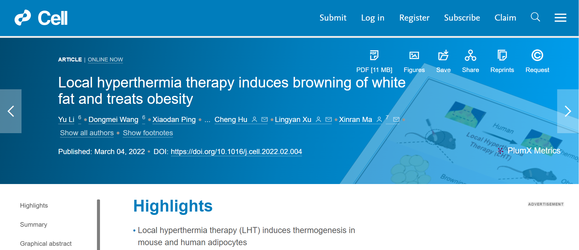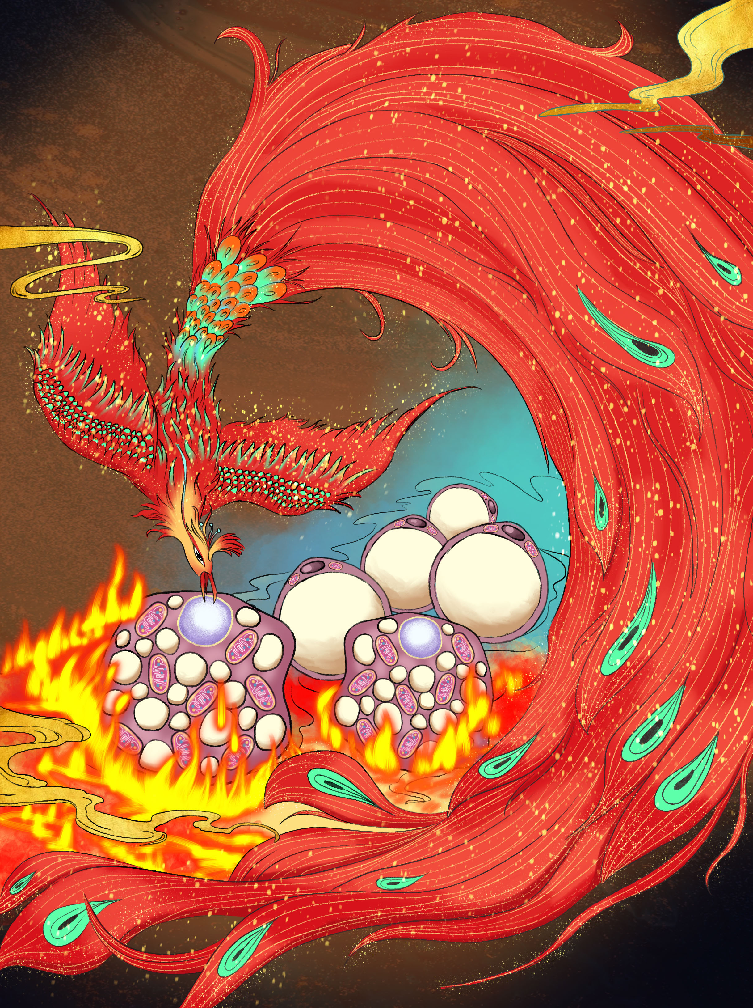 Cell 封面论文设计图:局部热疗促进白色脂肪棕色化,改善代谢健康。封面创意取自Pheonix故事(希腊神话的不死鸟和凤凰涅槃传说)。白色脂肪(White fat)经历热疗(Hyperthermia)后发生棕色化转变(Browning),迸发出能量(Pheonix),为人类带来健康。