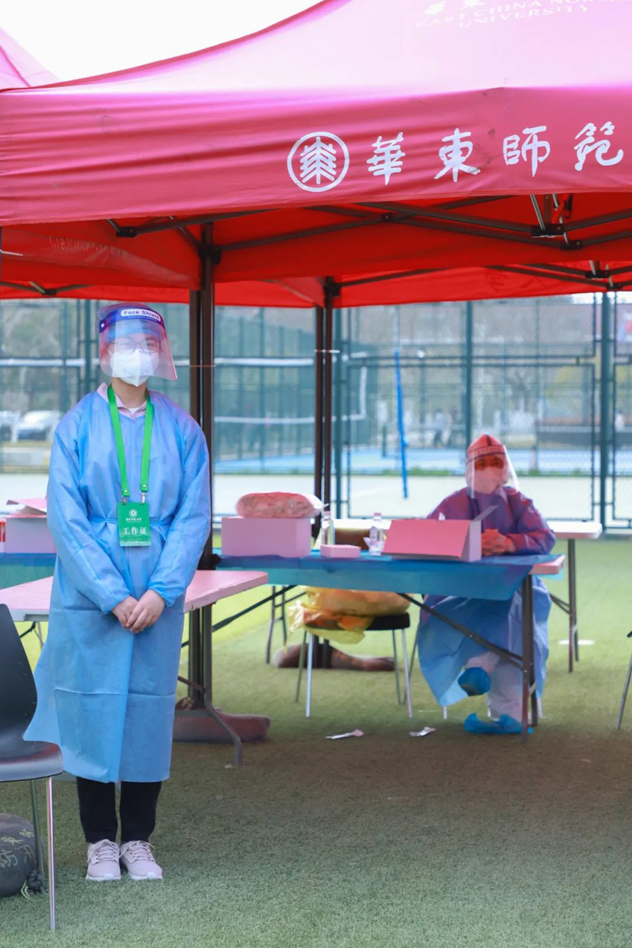 志愿者总队2019级物理专业的陈泽宇同学,14日结束了8点到10点物资运输岗的志愿工作后,脱下“蓝色小马甲”,又立马换上防护服,来到西操场进行核酸检测岗的引导工作,将课余时间排满、自己“连轴转”也不觉得累。