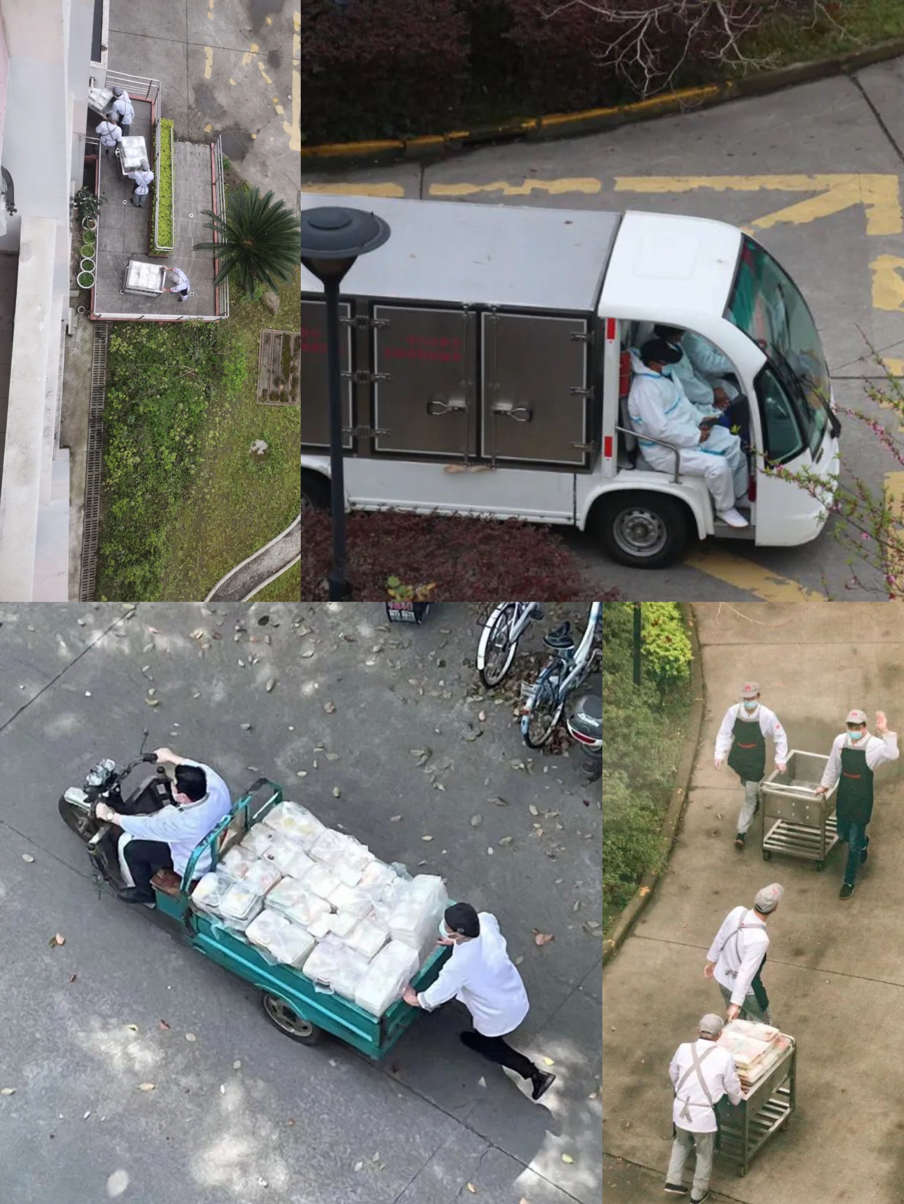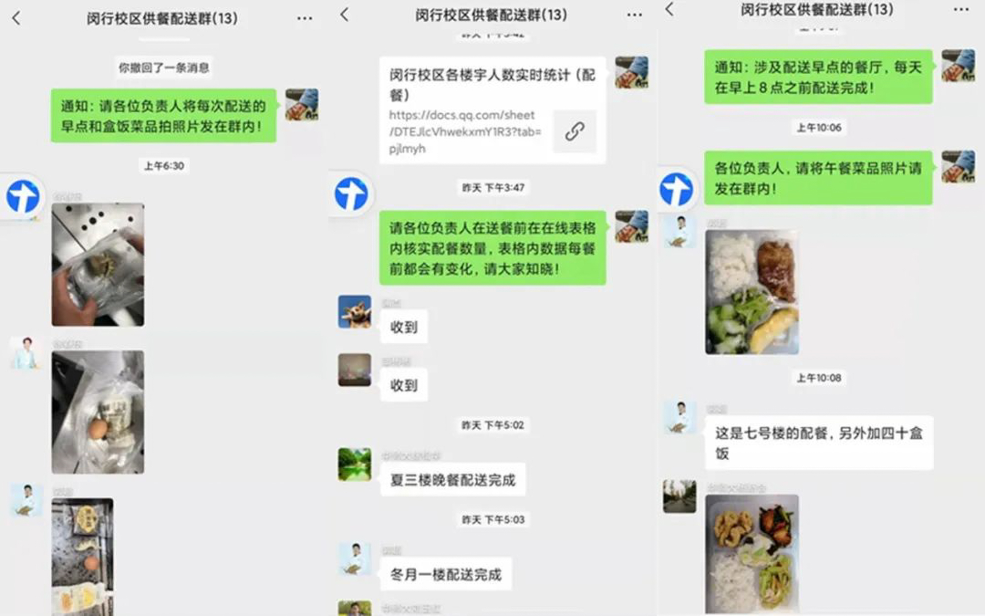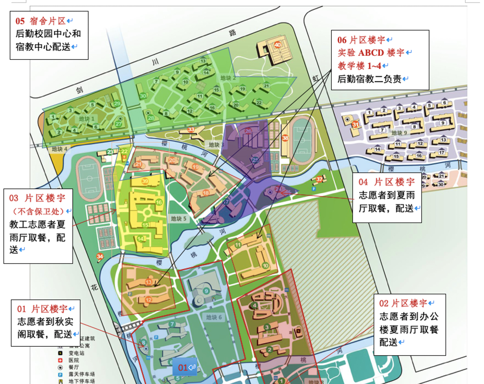 校园防疫施行网格化管理,闵行校区被划分6个网格:教学楼区教工志愿者派送,学生公寓区由后勤保障部统一调配人员车辆派送,其中普通餐由校园环境中心派送,清真餐由宿舍与教学服务中心2配送。