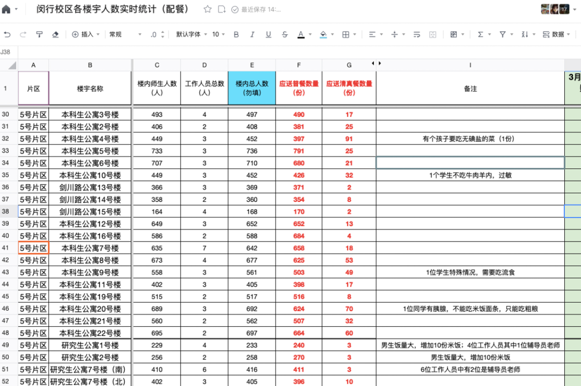 “素食”“无碘盐”“牛羊肉过敏”“吃粗粮”“吃流食”……每个学生都是大家的孩子,学校在特殊时期,在线共享表格,尽最大的努力收集学生需求,单独供餐。