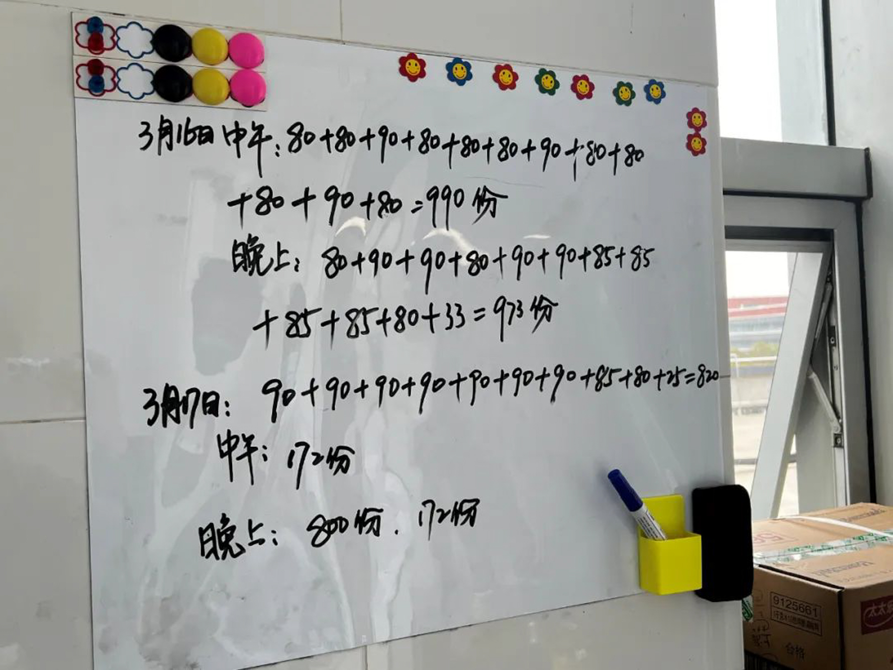 从3月19日开始将随早餐一起配送水果,尽力保证同学们在闭环管理期间三餐用餐规律、营养均衡,吃饱还要吃好。“8600,16438,16330……”这一串数字是每一餐动态统计的配餐数量,尽量做到精准统计,减少浪费。