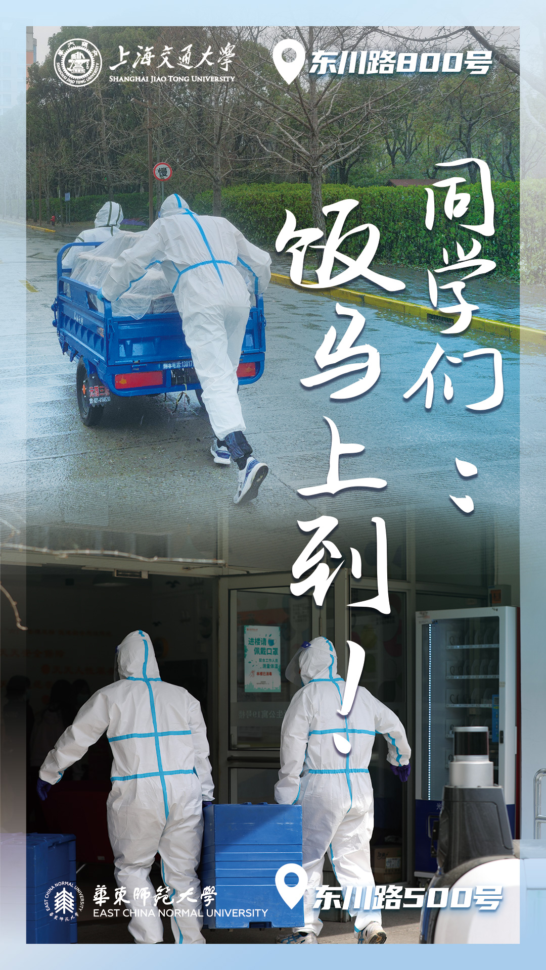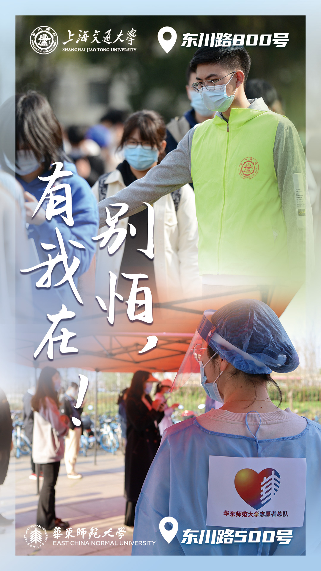 东川路上的日与夜,有你的“绿马甲”我的“蓝马甲”一同守护,第一时间行动起来,用有序和温暖给每一位同学传递信心。