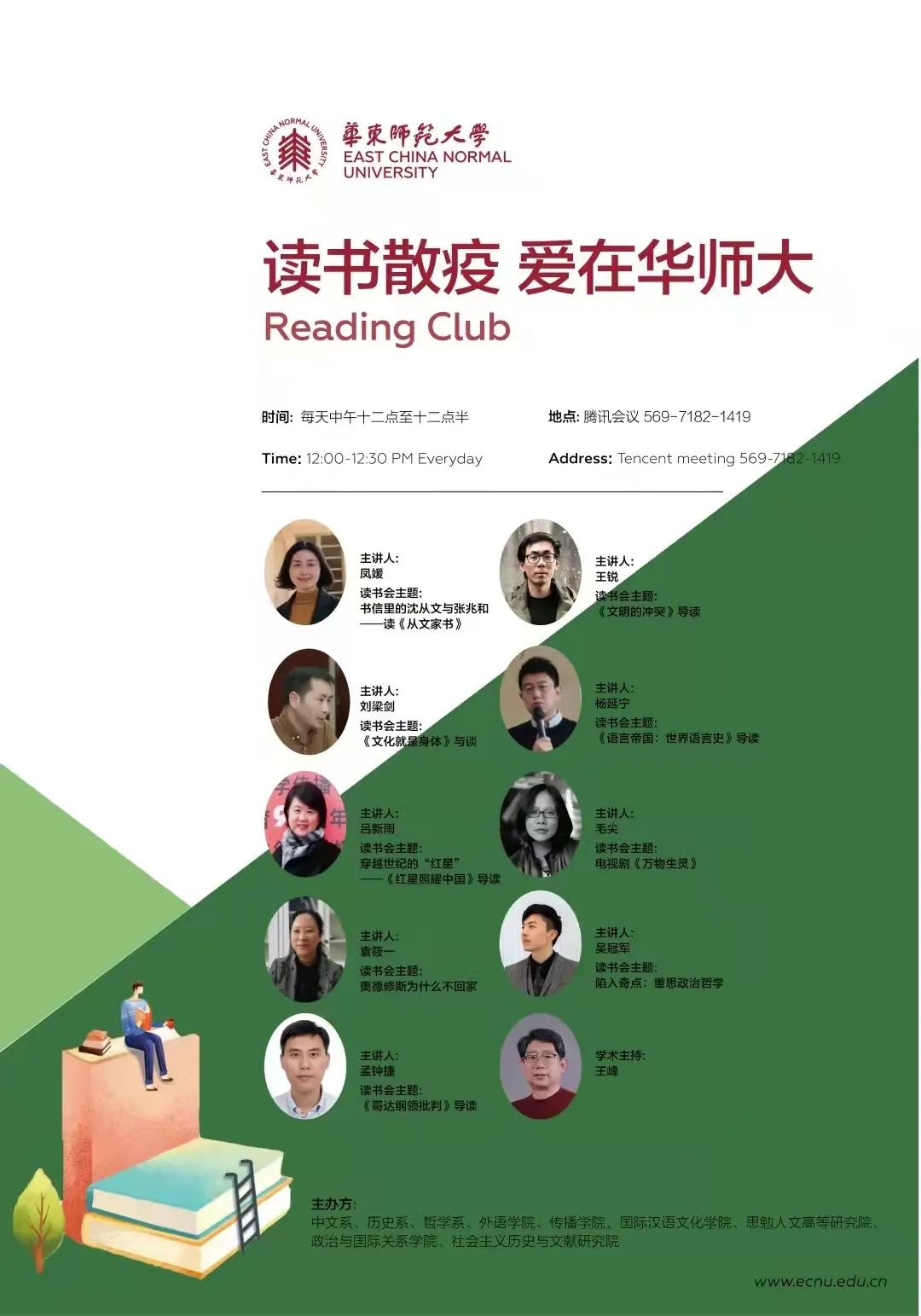 传播学院联合中文系、历史系、哲学系、外语学院、国际汉语文化学院、思勉人文高等研究院、政治与国际关系学院、社会主义历史与文献研究院共同发起“读书散疫,爱在华师大”线上读书会。活动通过腾讯会议平台开展,同时在完美网页版、完美网页版出版社Bilibili账号直播。广大师生一起用阅读抵抗焦虑,用思考安抚心灵,用沟通温暖孤独。