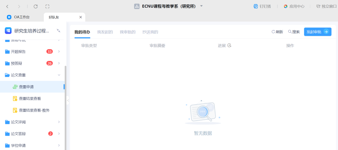疫情当前,研究生毕业论文提交在即,教育学部课程与教学系(研究所)发挥信息技术优势,利用“研究生培养全过程信息平台”,学生在论文检测和盲审前,使用该平台的查重、评阅和答辩功能,自主发起申请,导师在平台上审核,培养单位组织落实,实现了学生-导师-培养单位全过程联动式管理。