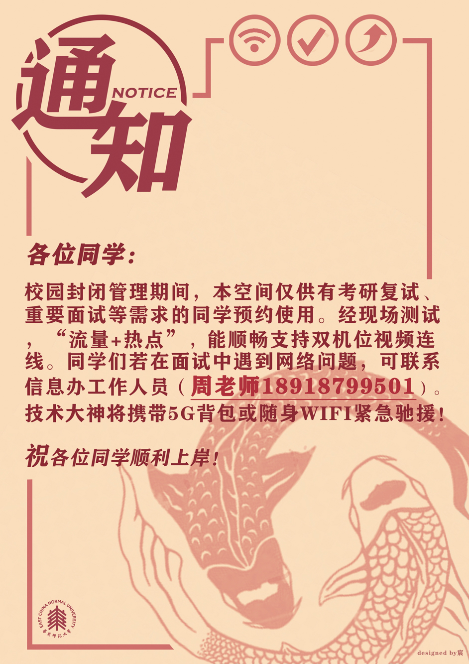 在教学楼区域,信息办针对教室的有线和无线网络进行了优化调整和压力测试,并与校外老师连线测试,实际效果均可满足线上复试的要求。复试当天,信息办技术支持老师将陪同考生提前一个小时到达复试教室进行各项设备的调试。学生复试时,志愿者会在外“守门”,防止有人意外闯入、手机外放声音干扰等意外情况发生。