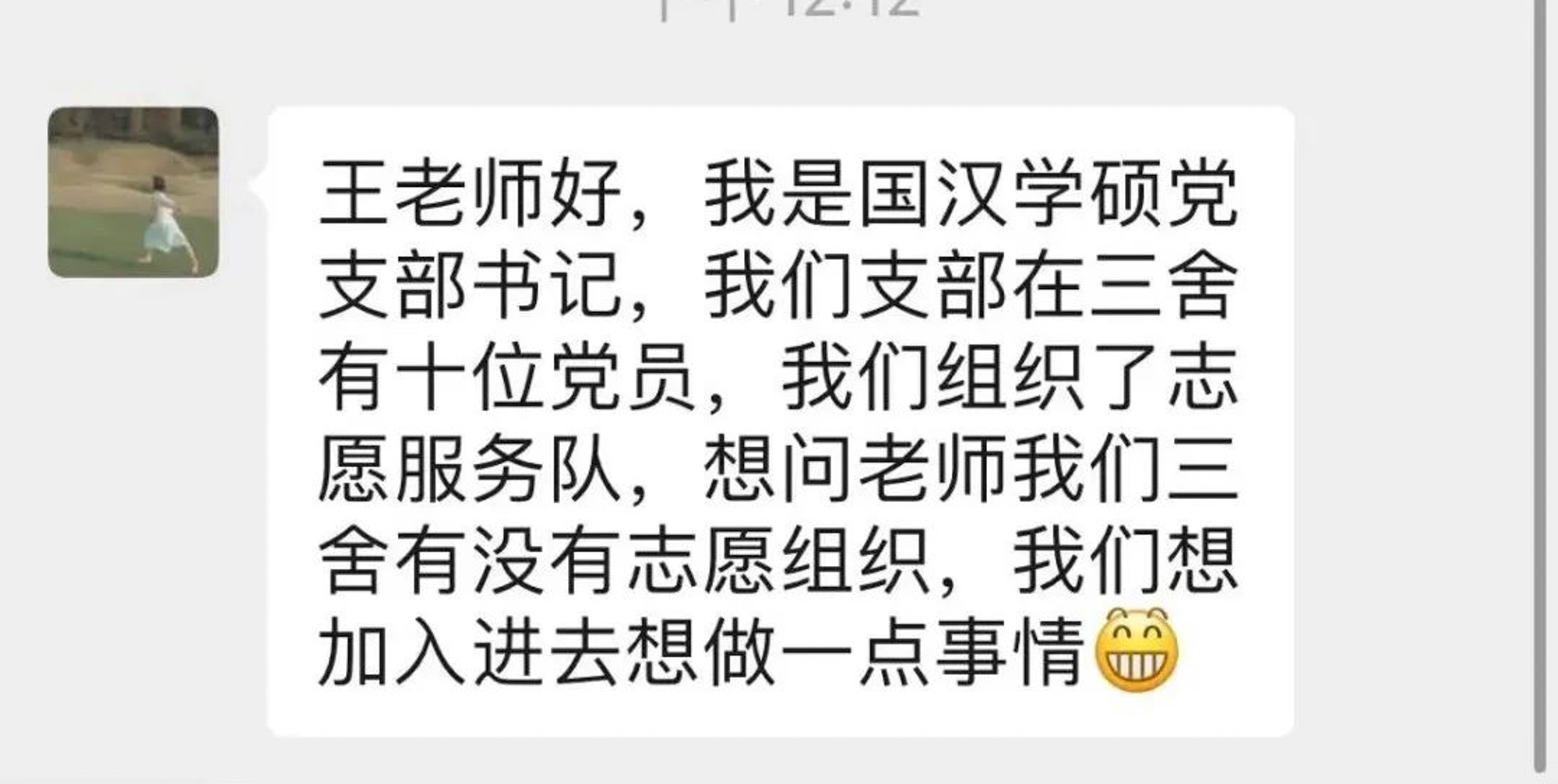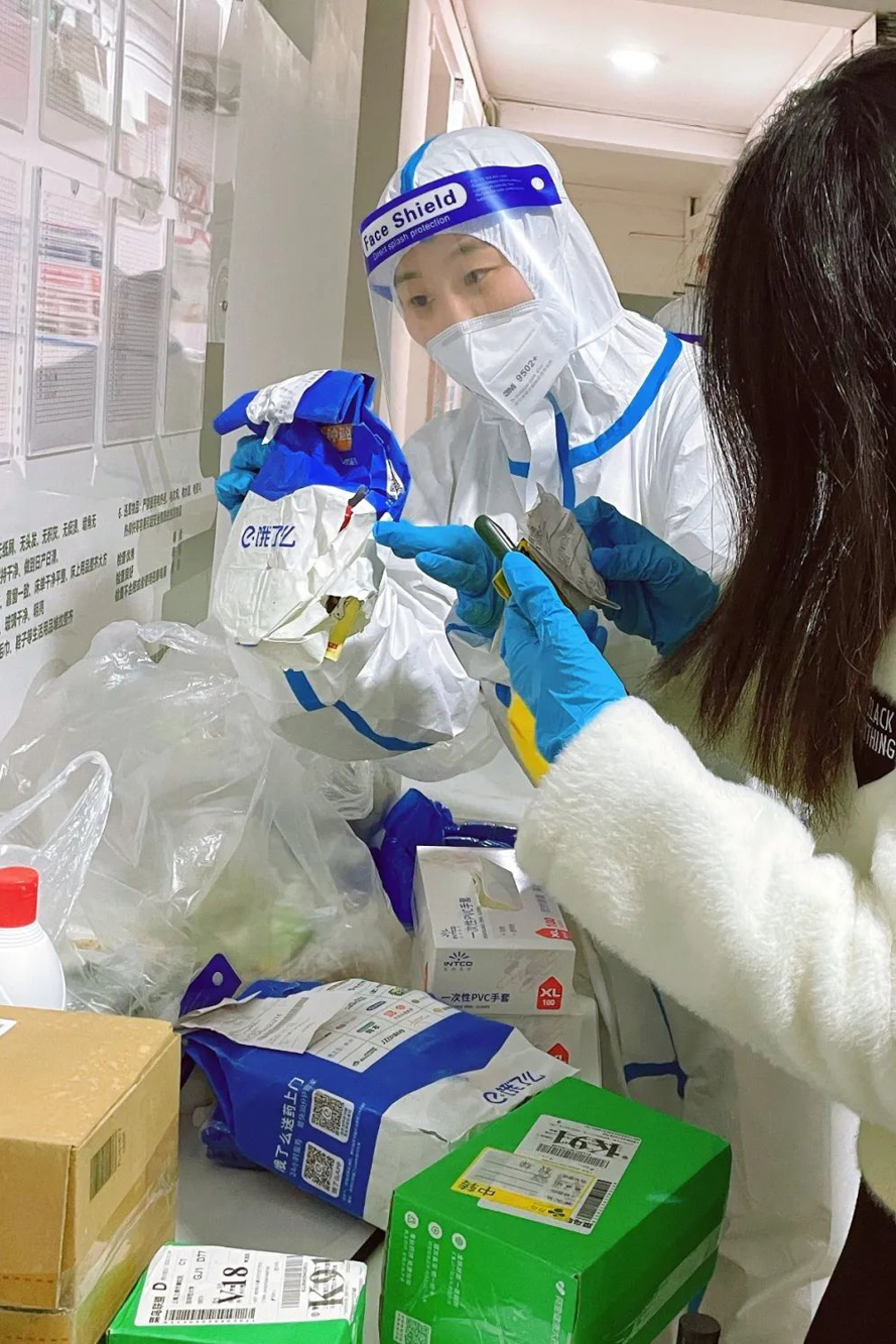 “学生党员们主动联系我,自觉组建党员服务队,亮出党员身份,协助楼层长派发三餐,让我很感动,也很快抛开恐惧和杂念。虽然家里的孩子还小,需要妈妈,但是校园封控区里的同学们更需要辅导员作为她们的主心骨。”王佳宁回忆道。