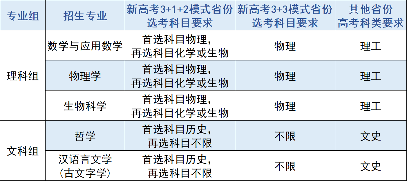 服务国家重大战略需求的基础理科学科以及国家人才紧缺的社会科学与人文学科领域,招生专业、选考科目、科类要求及招生计划见下表: