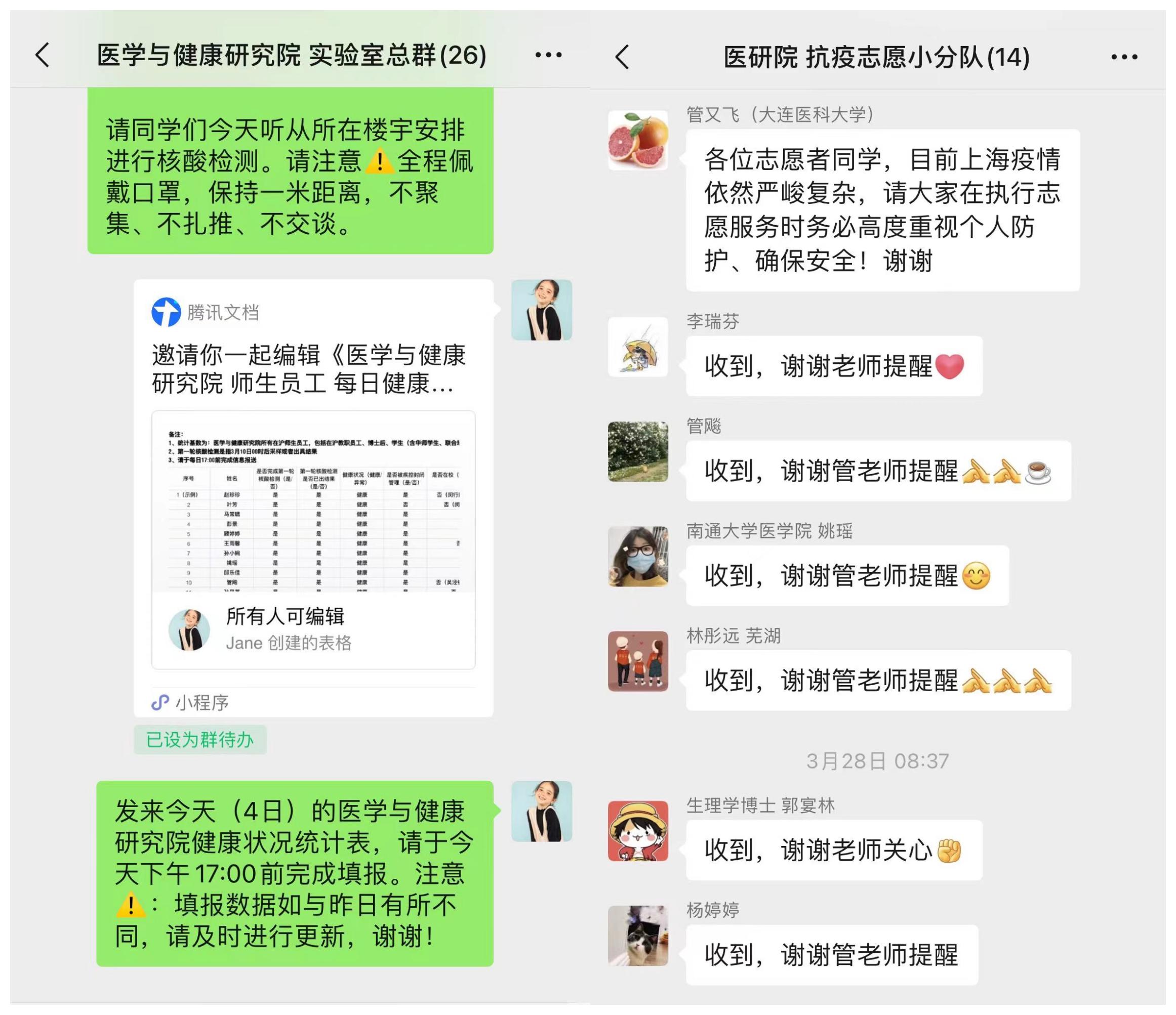疫情期间,医学与健康研究院积极贯彻落实学校疫情防控的的各项要求和工作部署,每日统计报备在沪师生健康状况。同时与学生进行不定时沟通,帮助学生缓解焦虑情绪,合理安排时间,以实际行动合理支持疫情防控行动。