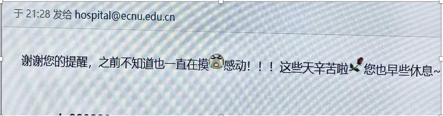 21级博士生郭宴林回忆起在值班过程中印象深刻的一个病例。“4月1日,一名临近毕业的大三体院同学,3天前出现腹部皮疹,伴瘙痒,腋下出现包块,伴触痛,无发热,遂于校医院就诊”。简单检查后,郭宴林判断为腋下皮脂腺囊肿,腹部过敏性皮疹,给他开了氢化可的松软膏外用,口服氯雷他定抗过敏治疗,同时配合炉甘石洗剂使用,叮嘱他不要抓挠。通过聊天得知,这位同学因为临近毕业再加之疫情封校,寝室缺乏专业的锻炼器材,担心身体机能下降,影响就业,因此情绪一直很低落。于是郭宴林对其进行了积极的心理疏导,鼓励他乐观面对学习与生活。在之后的随访中,也了解到该同学症状有了明显改善。