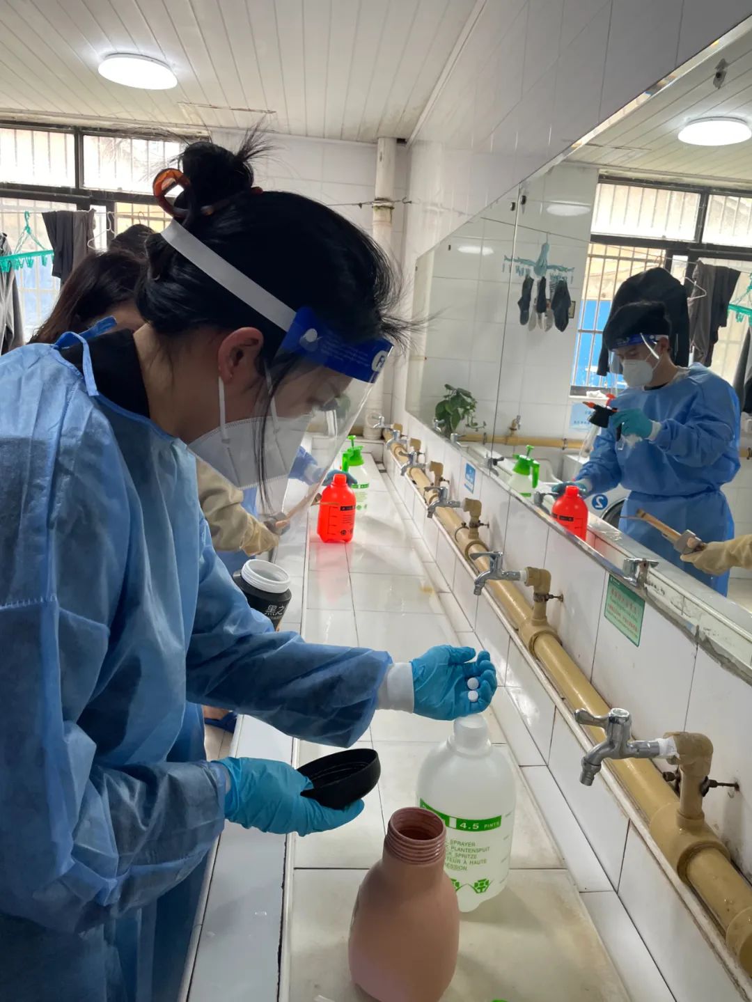 普陀校区河西片区第十二宿舍消杀志愿者学习调配消毒液