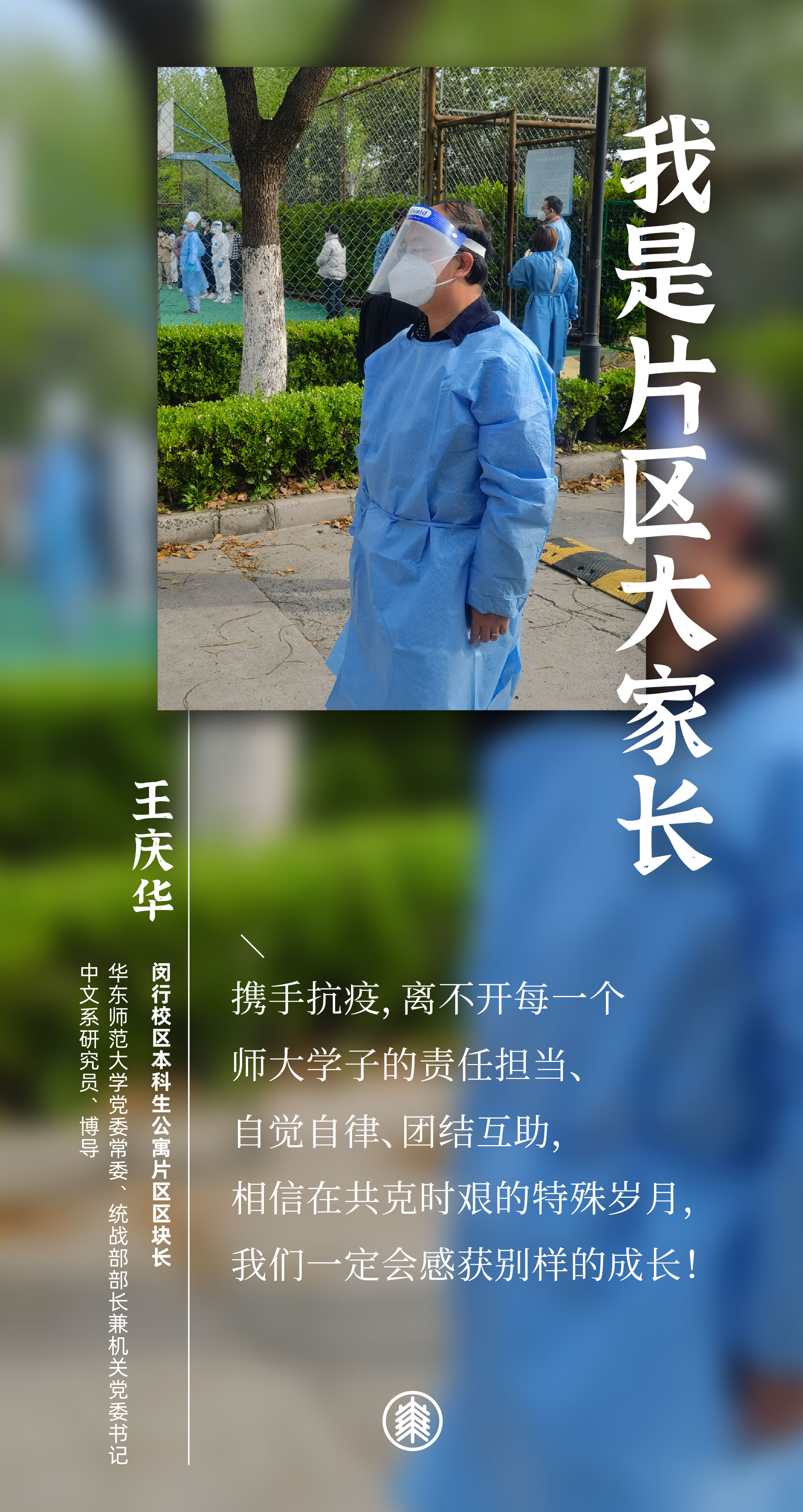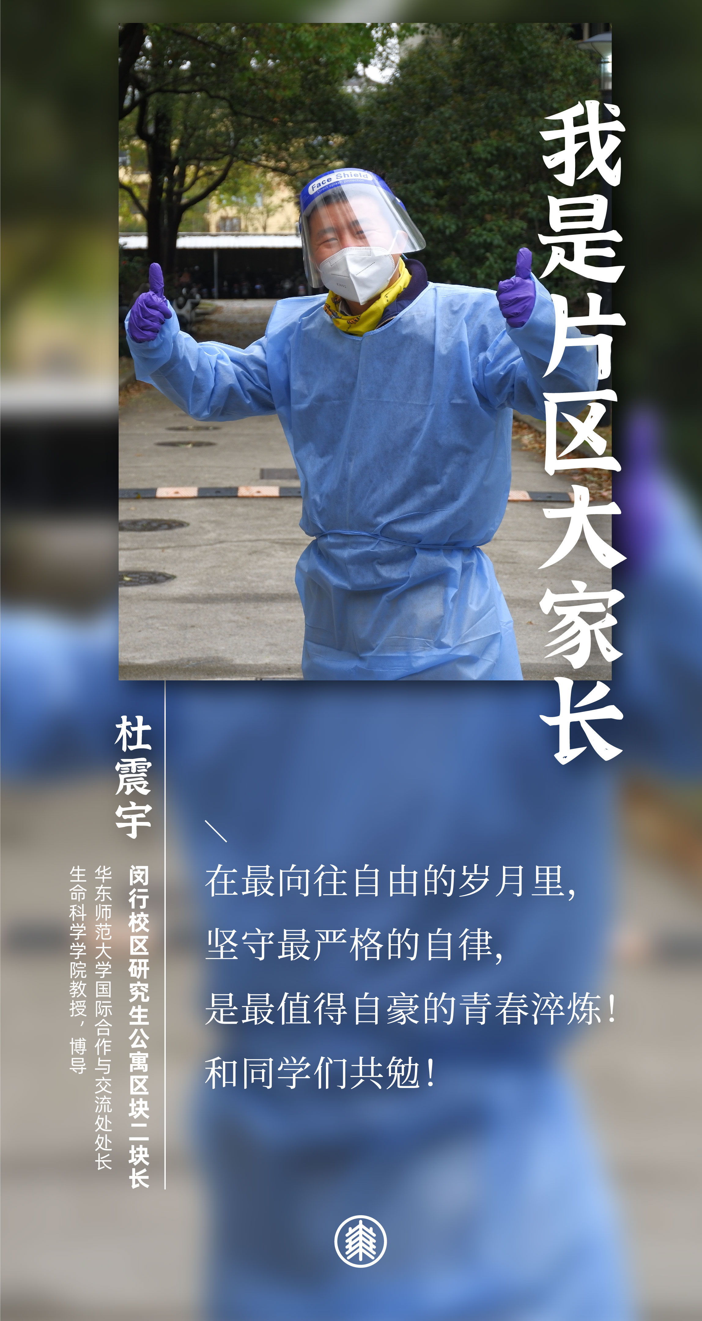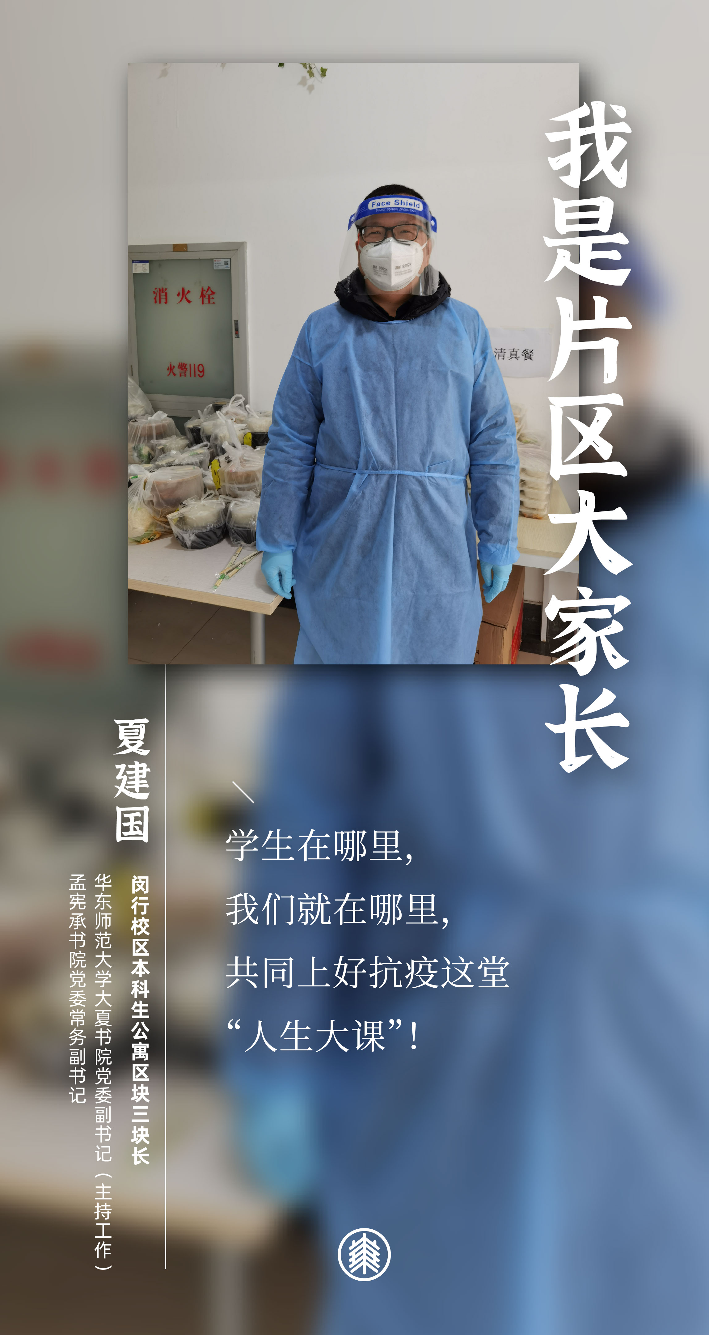 闵行校区划分为四大片区:教学科研区域、本科生公寓片区、研究生公寓片区,以及虹梅南路青年教师公寓片区。战疫40天,10位担任区块长的老师们,都有一个共同的名字和责任——“片区大家长”。
