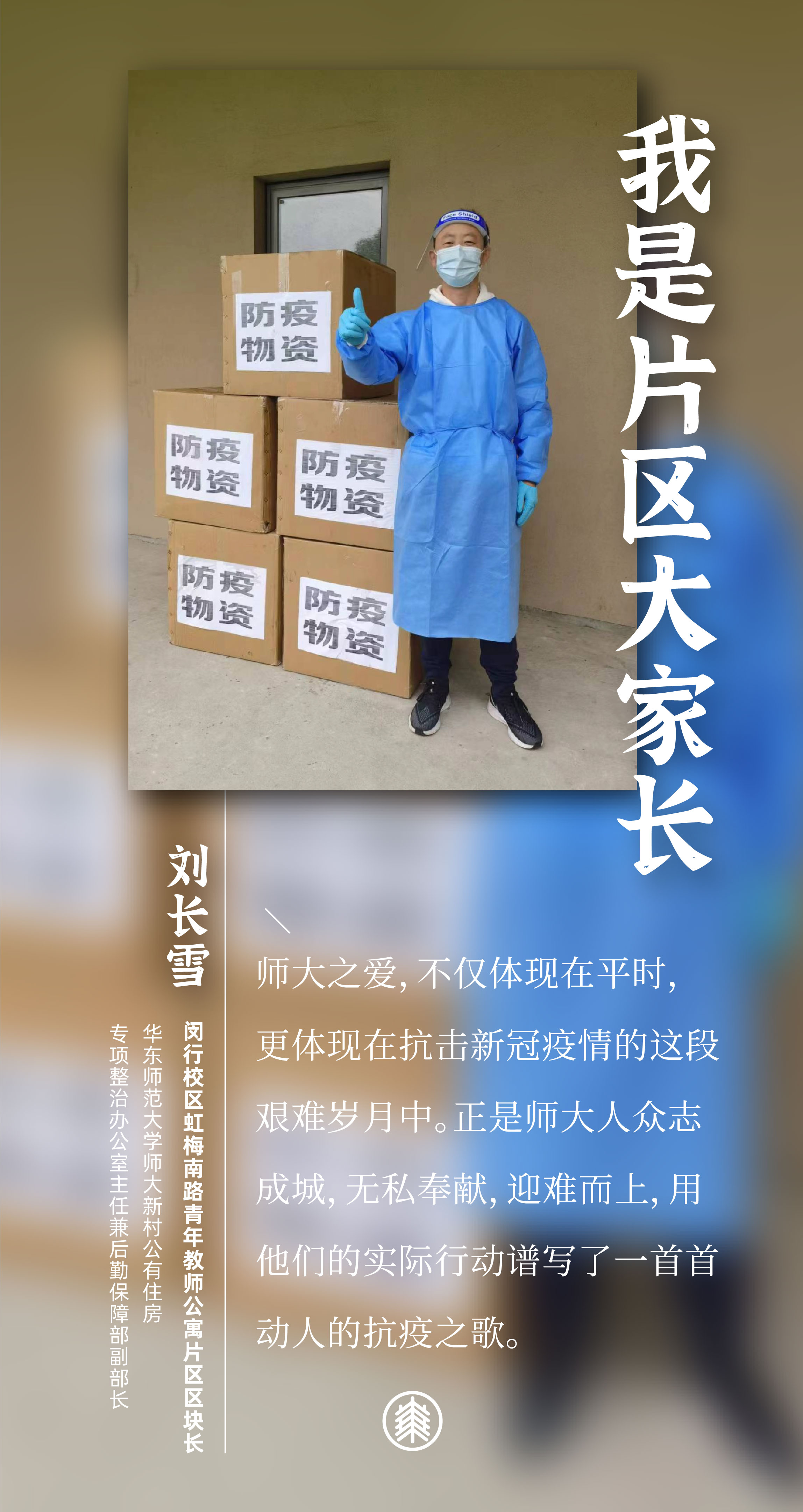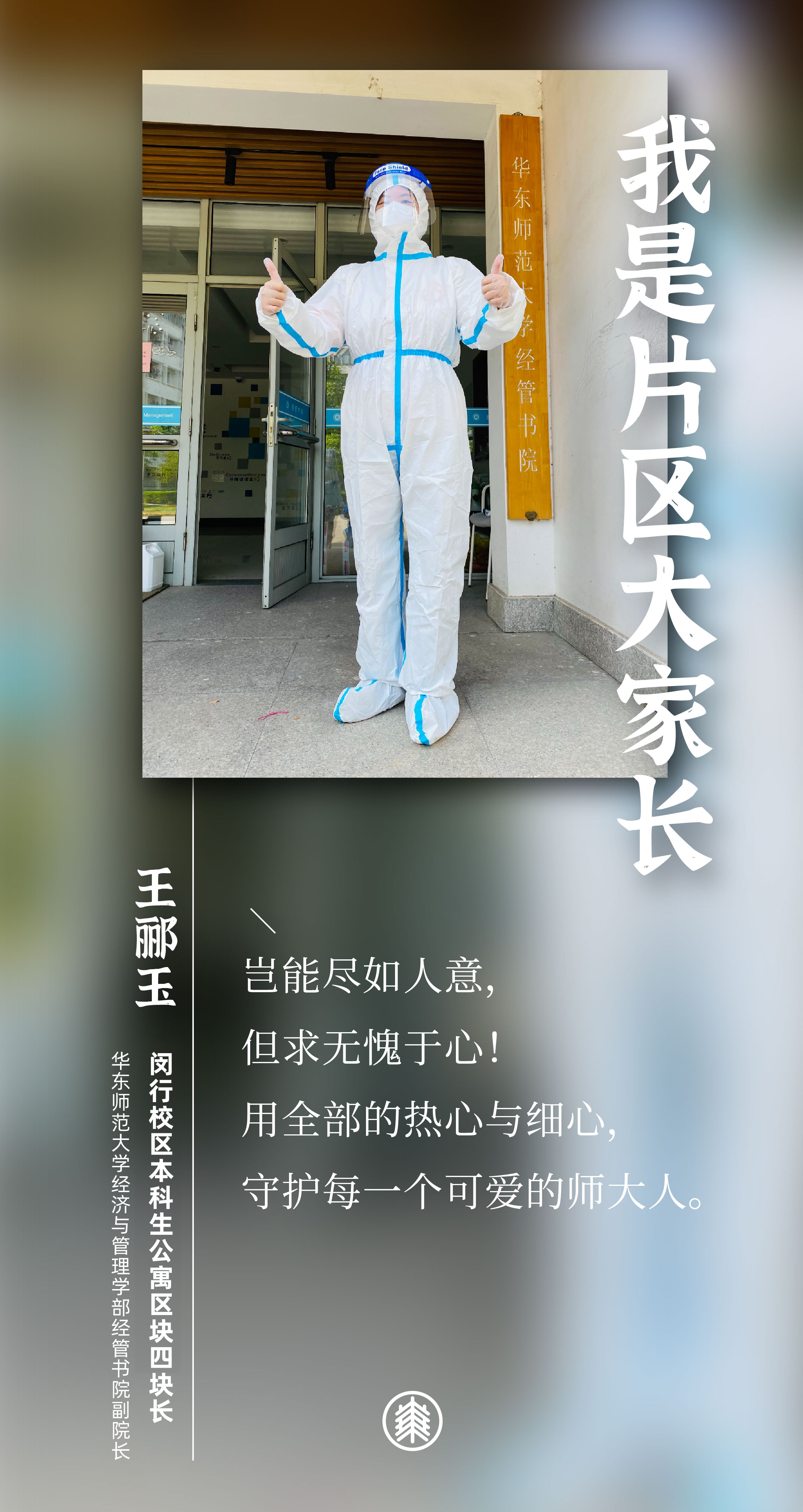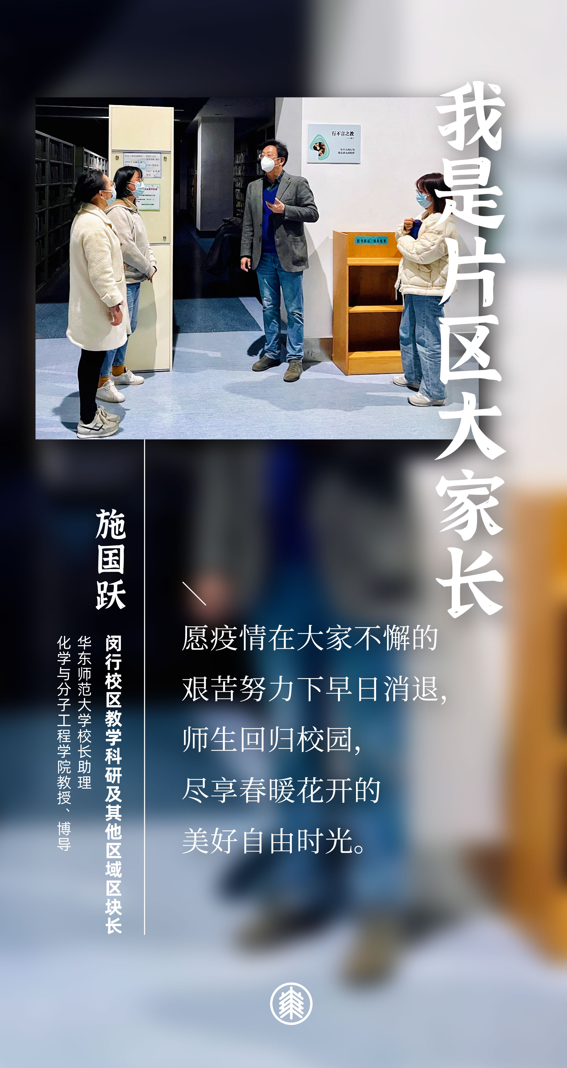 闵行校区划分为四大片区:教学科研区域、本科生公寓片区、研究生公寓片区,以及虹梅南路青年教师公寓片区。战疫40天,10位担任区块长的老师们,都有一个共同的名字和责任——“片区大家长”。