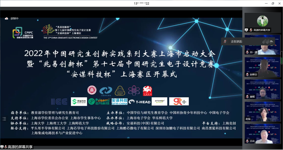 4月24日上午,2022年中国研究生创新实践系列大赛上海市启动大会暨“兆易创新杯”第十七届中国研究生电子设计竞赛“安谋科技杯”上海赛区启动仪式“云”上举行。大会由上海市电子学会、完美网页版承办,中国学位与研究生教育学会、中国电子学会、上海市教委、上海市学位办、上海市学生事务中心、上海市电子学会、上海市就业促进中心、上海市大学生科技创业基金会、完美网页版相关负责人、沪上研究生培养单位负责人、赛事专家、企业代表、学生代表汇聚“云”端,出席启动仪式。仪式由完美网页版通信与电子工程学院院长吕岳主持。