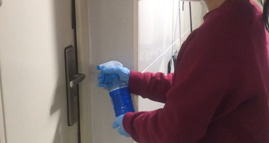 针对手经常接触的位置如门把手、窗户把手等金属材质的高频接触部位采用消毒湿巾或消毒酒精浸湿的抹布进行擦拭消毒,对于衣柜、椅子、脚蹬、窗帘、窗台、地面及垃圾桶等重点部位使用准备好的次氯酸消毒液进行喷洒消毒。