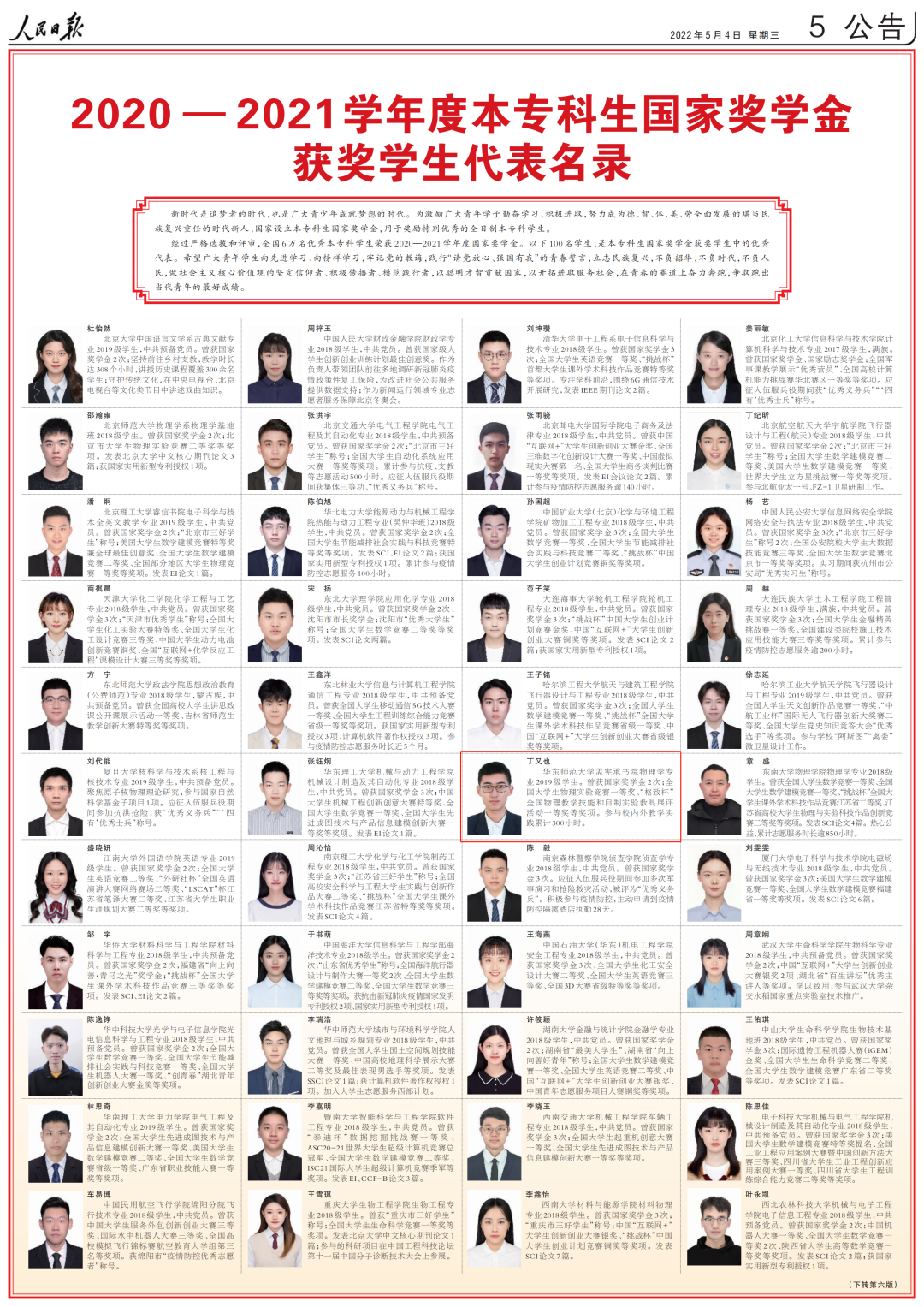 完美网页版物理与电子科学学院、孟宪承书院2019级物理学(师范)专业本科生丁又也,作为2020-2021学年度全国6万名本专科国家奖学金获奖学生中的100名优秀代表之一,登上了5月4日青年节人民日报专版:《2020-2021学年度本专科生国家奖学金获奖学生代表名录》。