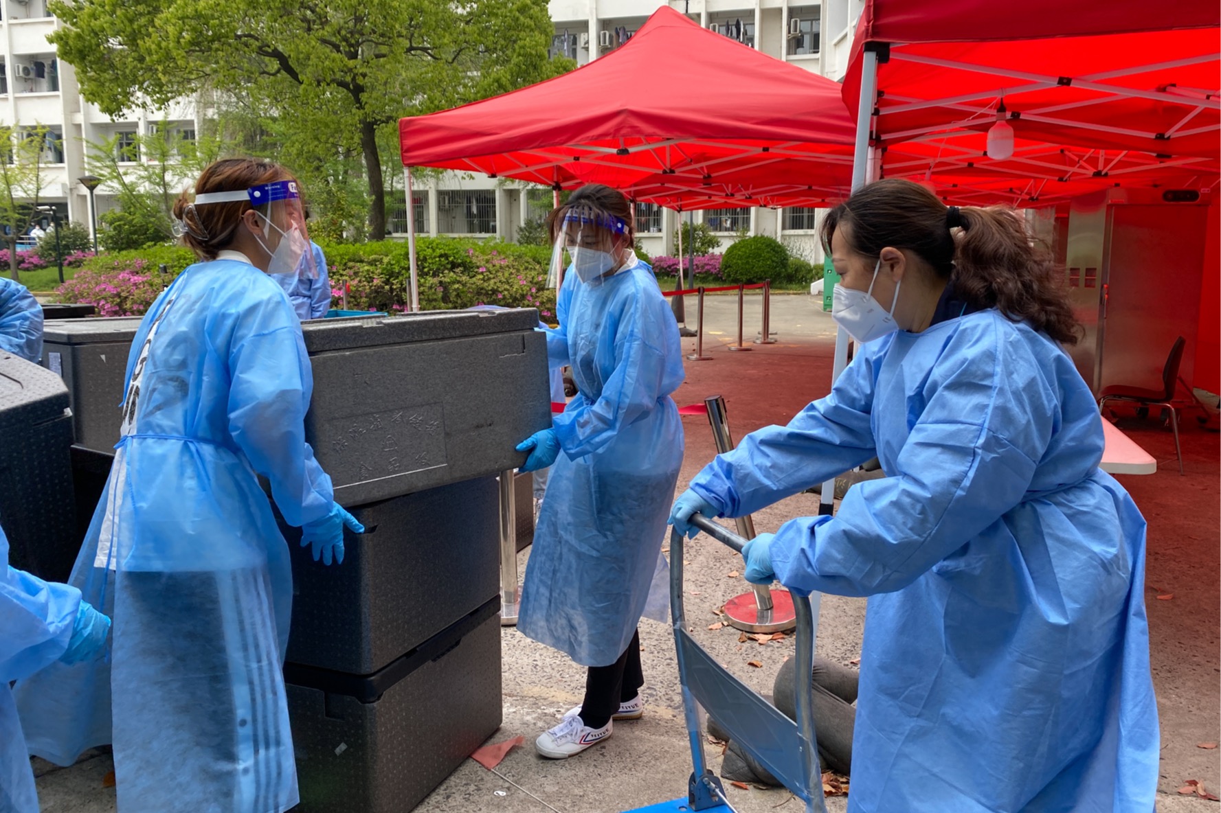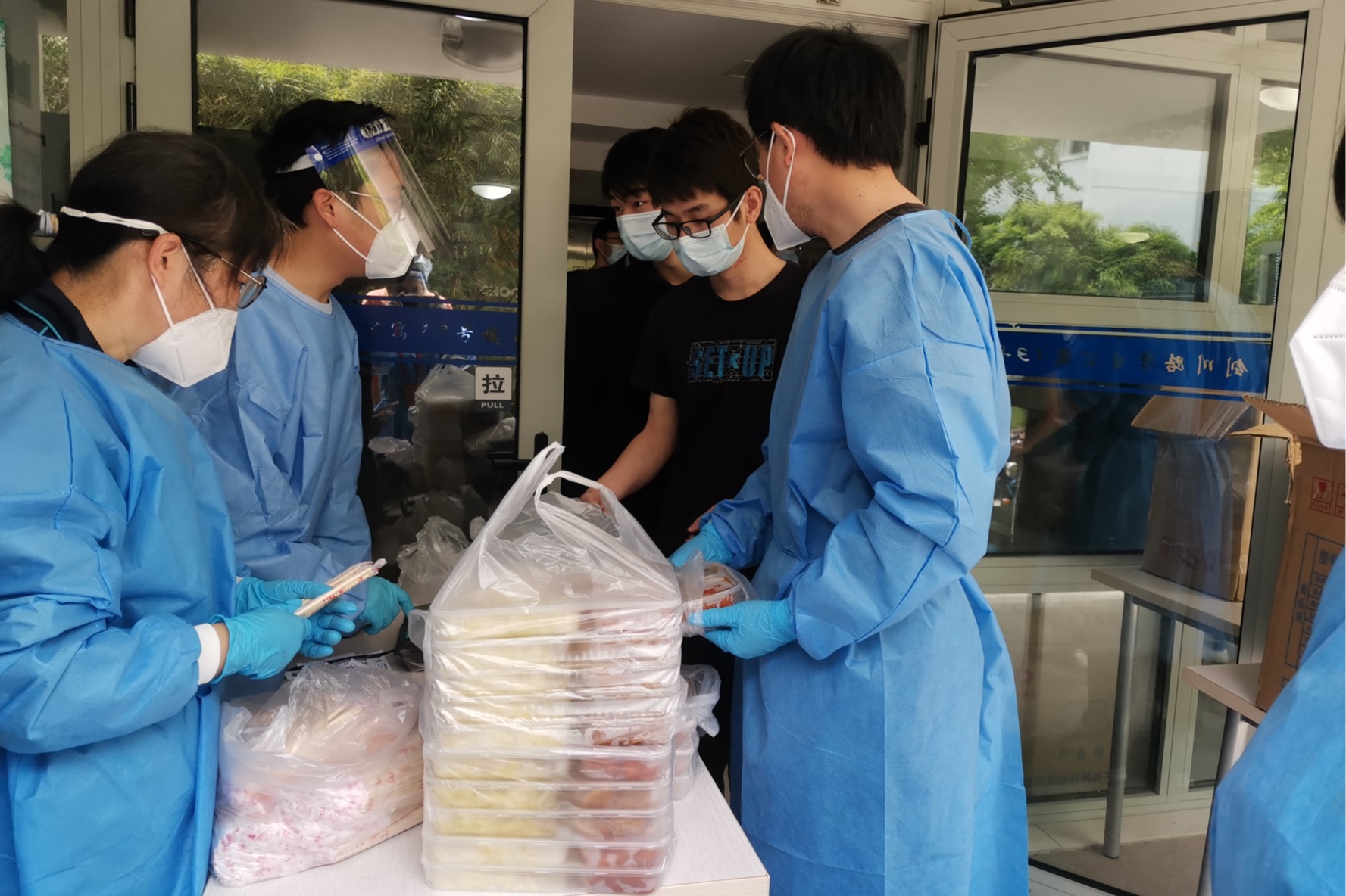 由于校园封闭管理,学校送来的所有物资全部依靠区块二的师生志愿者配送运至各楼栋。