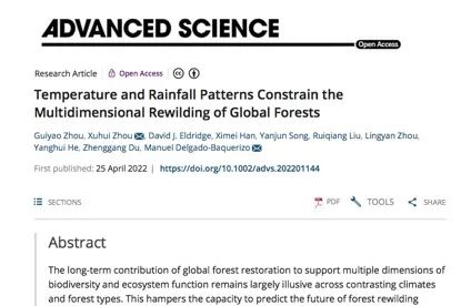 相关研究成果4月25日以“Temperature and rainfall patterns constrain the multidimensional rewilding of global forests”为题在线发表于综合类顶尖期刊Advanced Science。
