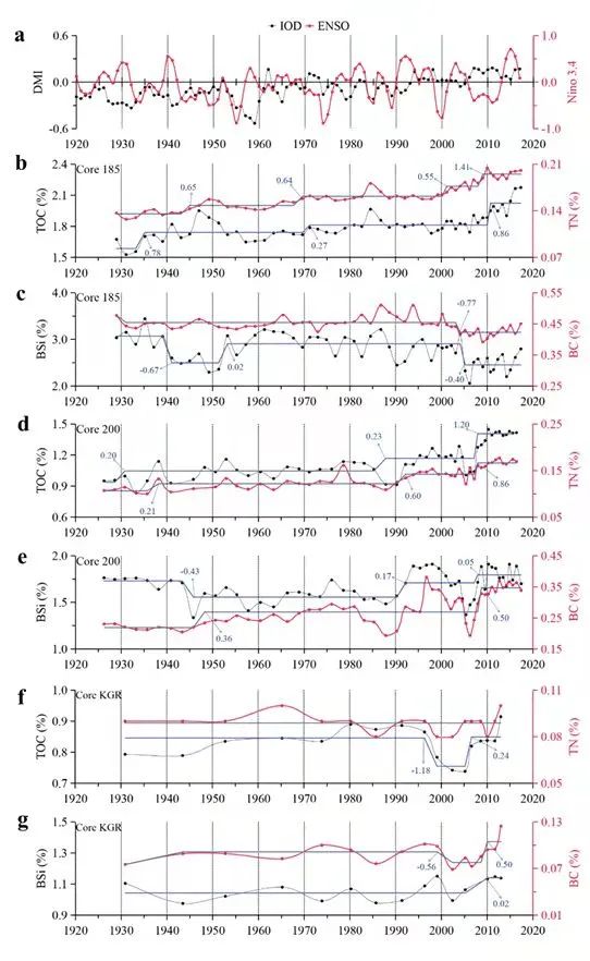 研究发现,水柱中的PER(甲藻特征色素)相对于FUCO(硅藻特征色素)以及其他色素有着更强的表层-底层浓度耦合特征。沉积物中的PER含量可能受到甲藻赤潮的影响比较大,而FUCO以及其他特征色素受到赤潮的影响更小。通过降解模型消除色素早期成岩作用影响后,研究发现沉积物中的PER/FUCO的比值拐点出现在20世纪90年代初。