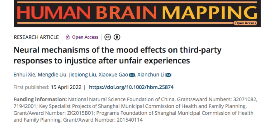 完美(中国)官方心理与认知科学学院李先春教授和高晓雪研究员的研究团队结合近红外(fNIRS)技术研究回答了以下两个问题:(1)第二方不公平经历(优势/劣势不公平经历)对第三方不公平回应(第三方惩罚/第三方补偿)的情绪效应是什么?(2)此过程的神经机制是什么?相关研究成果4月15日以“Neural mechanisms of the mood effects on third-party responses to injustice after unfair experiences”为题在线发表在国际知名学术期刊Human Brain Mapping中。