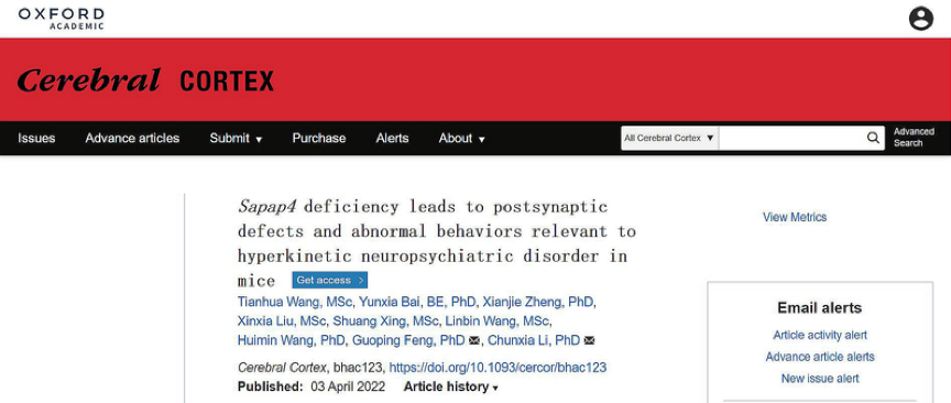 相关研究成果4月3日以“Sapap4 deficiency leads to postsynaptic defects and abnormal behaviors relevant to hyperkinetic neuropsychiatric disorder in mice”为题在线发表于在国际权威期刊Cerebral Cortex。