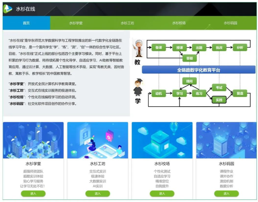 与传统慕课平台不同,“水杉在线”利用云计算平台构建大规模线上实践场所,利用开源软件构建实践项目,并提供在线实训、在线编程自动评测和社交化软件项目协作等多项服务,让学生的动手实践得以全部在线上进行。同时,基于“水杉在线”上学生行为数据,制定针对性、个性化教学方案,进一步构建科学有效的过程性评价体系,解决了传统课堂教学难以适应数字化人才培养的关键问题。