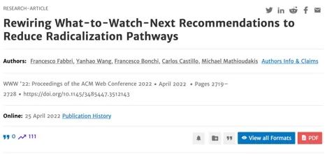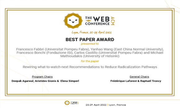 这项研究成果4月25日以“Rewiring What-to-Watch-Next Recommendations to Reduce Radicalization Pathways”为题发表于CCF A类推荐国际顶级会议The ACM Web Conference 2022 (WWW '22),并获得会议唯一最佳论文奖项(Best Paper Award),王延昊副教授为第二作者,合作单位包括西班牙庞培法布拉大学、意大利ISI基金会和芬兰赫尔辛基大学。