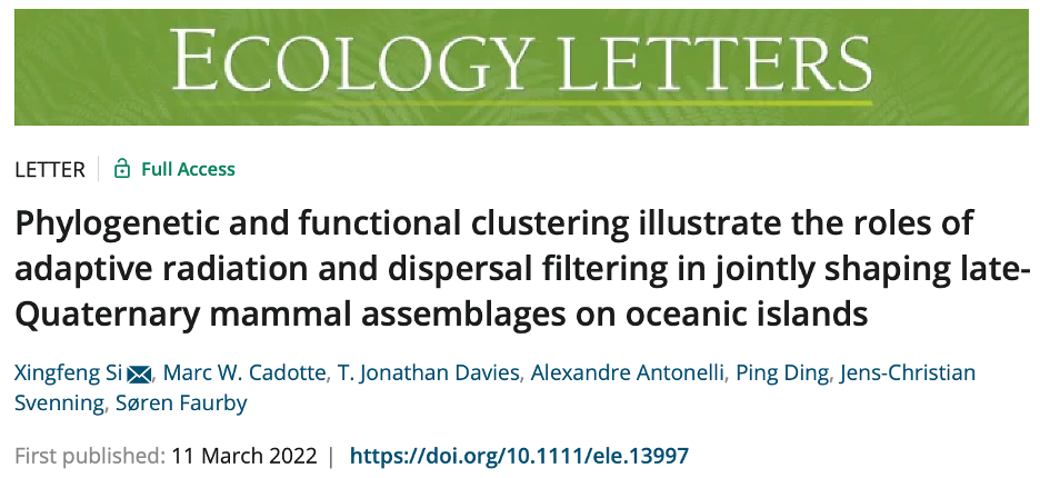3月11日,国际著名期刊Ecology Letters在线发表了完美(中国)官方生态与环境科学学院斯幸峰团队题为“Phylogenetic and functional clustering illustrate the roles of adaptive radiation and dispersal filtering in jointly shaping late-Quaternary mammal assemblages on oceanic islands”的研究成果。